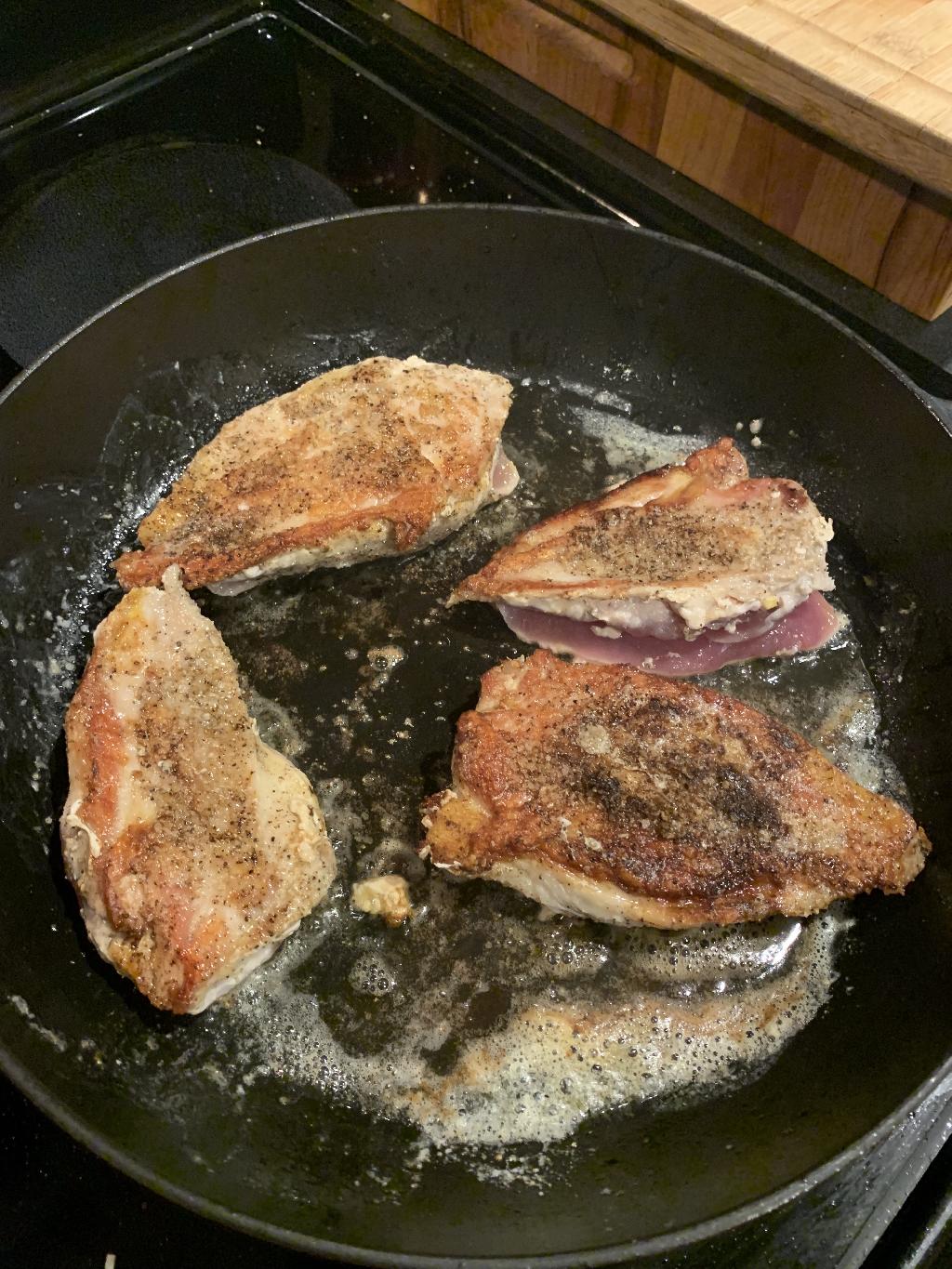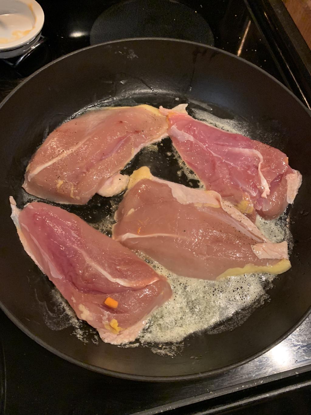 Step #4 Place Pheasant, skin side down, in hot pan and allow to cook for 3-4 minutes, under skin starts to brown