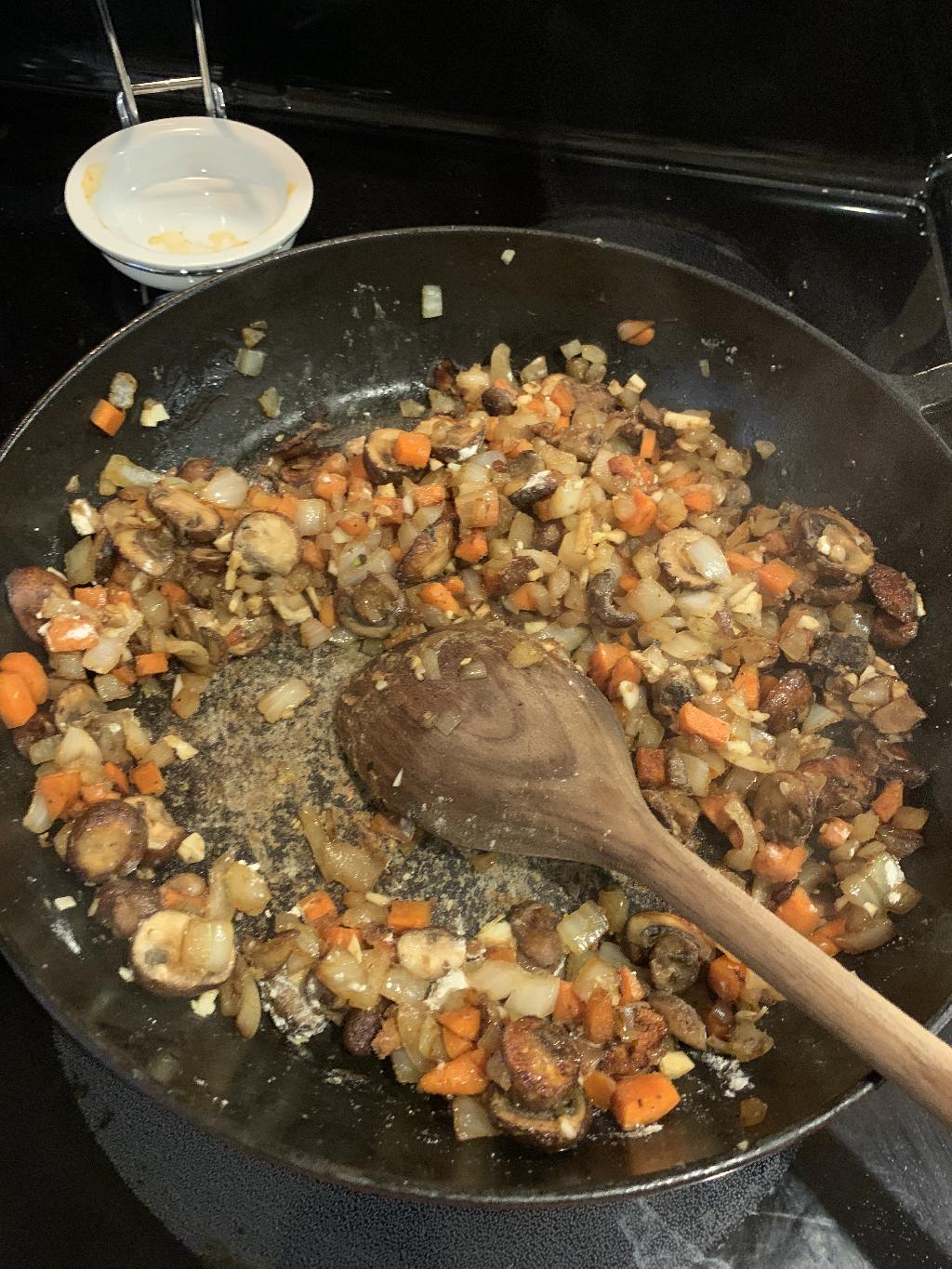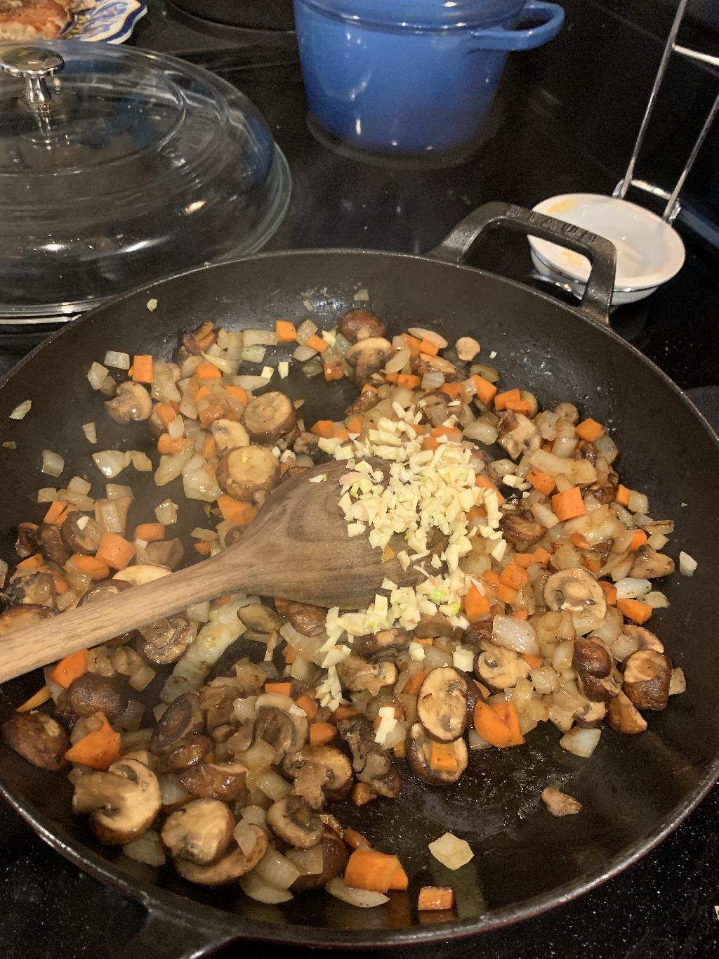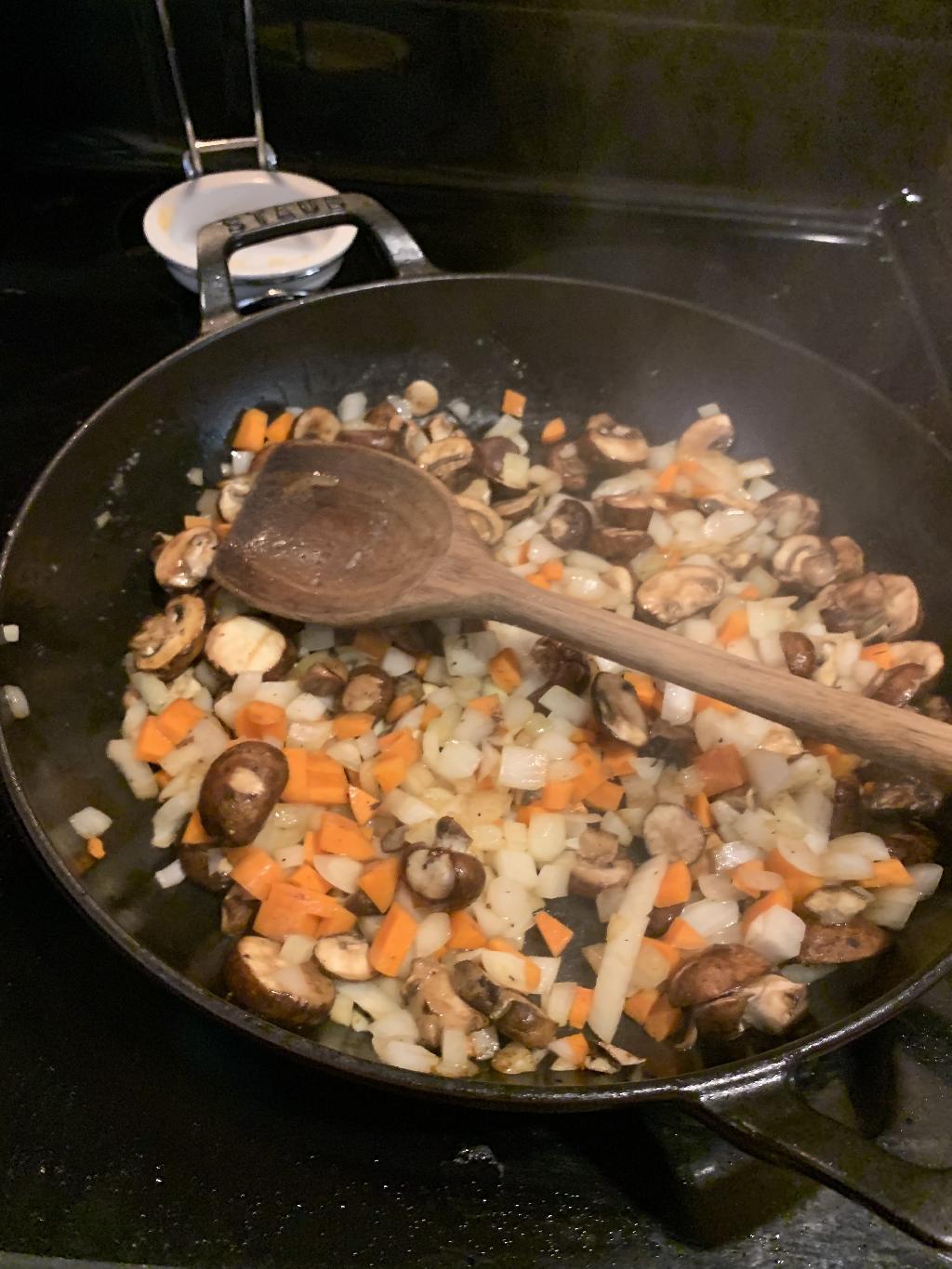 Step #7 Add diced Onion, Carrots and Mushrooms to hot skillet and allow to cook 5 to 7 minutes.