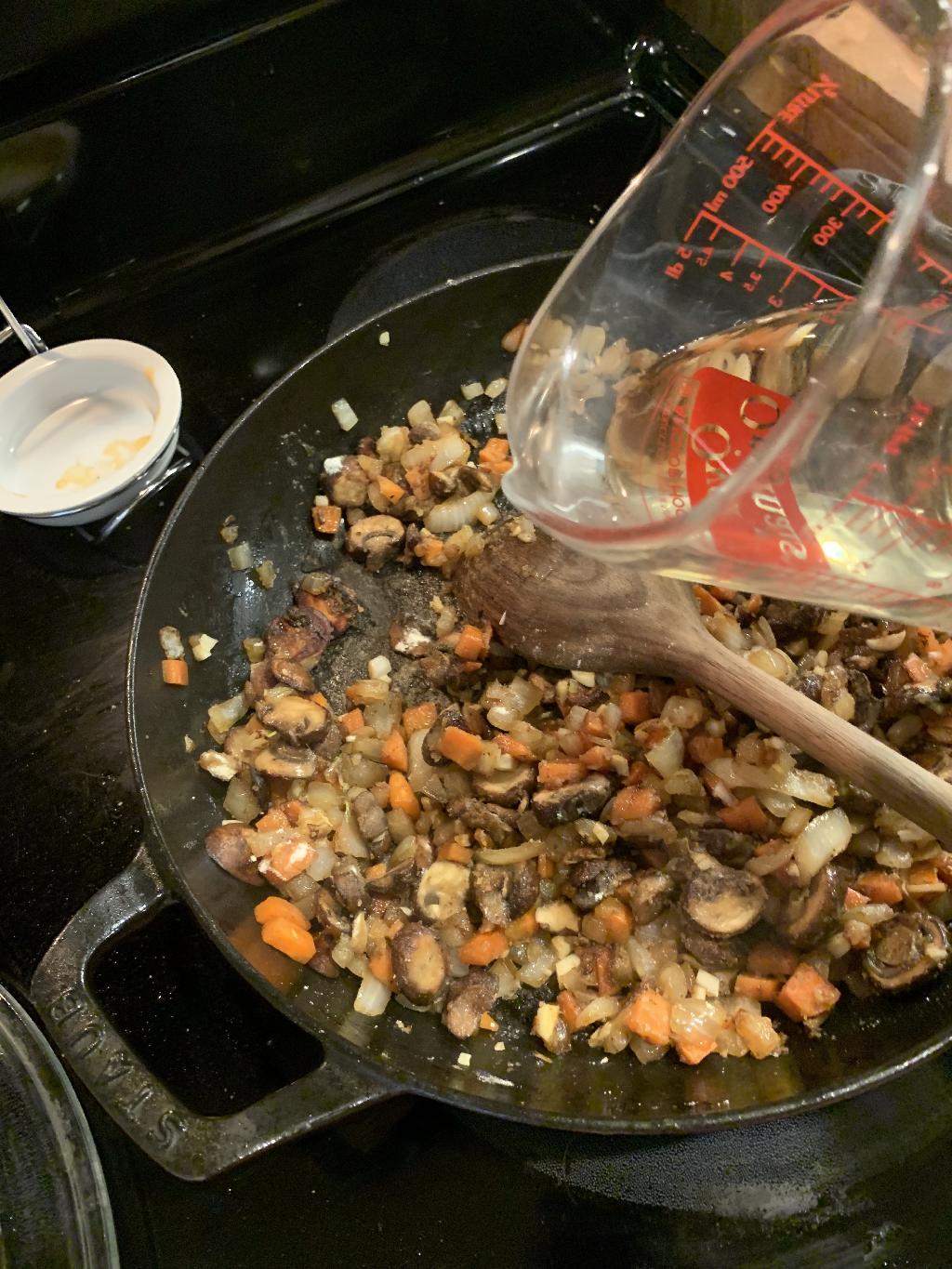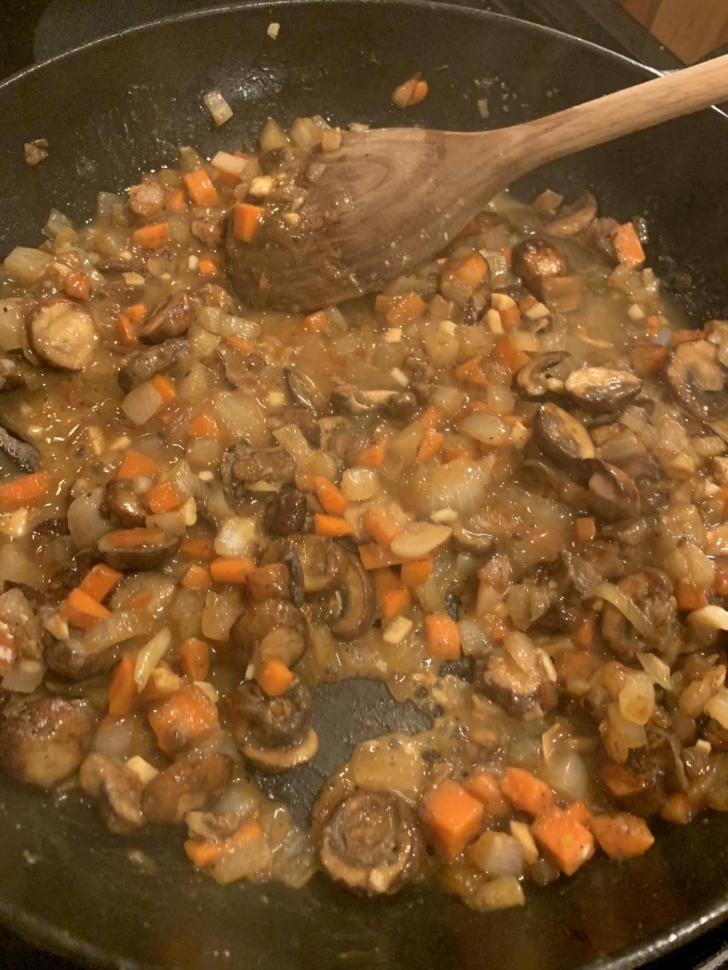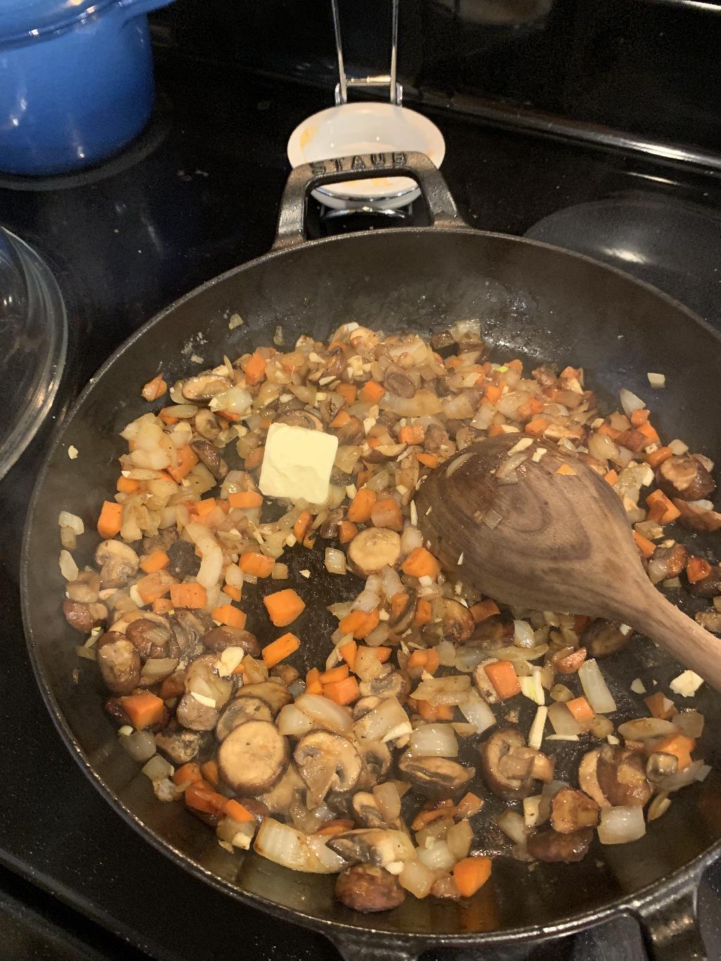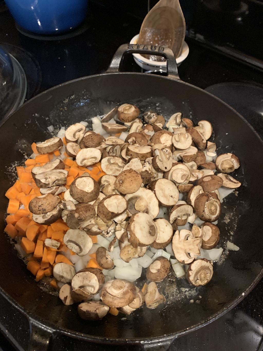 Step #7 Add diced Onion, Carrots and Mushrooms to hot skillet and allow to cook 5 to 7 minutes.