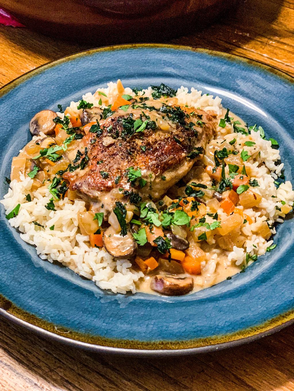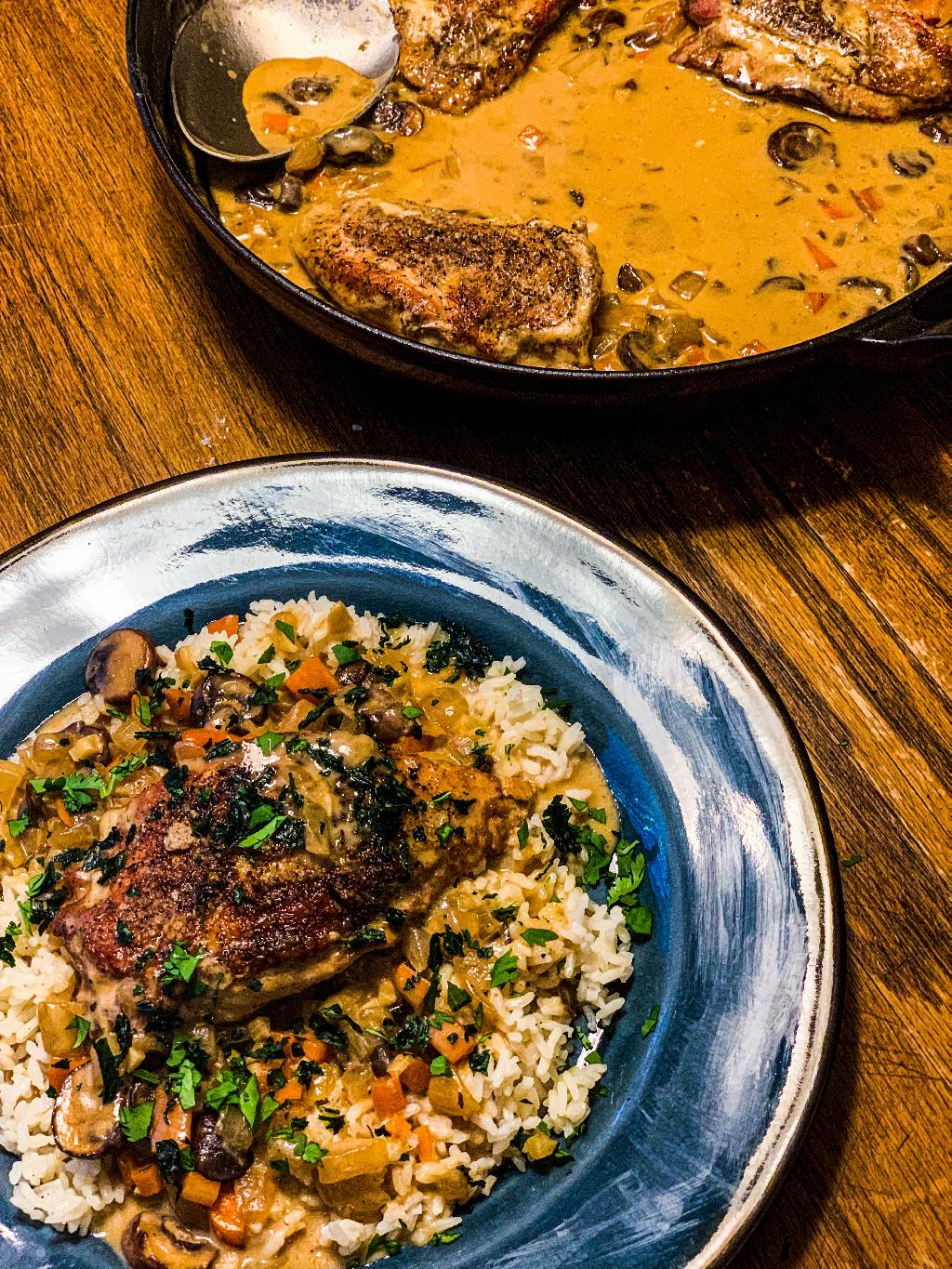 This fricassee is basically like a stew, with pieces of Pheasant meat that have been browned in butter, then braised in a white sauce made from pheasant stock. Im leaving the skin on for this recipe, so the outside of the pheasant gets brown and crispy. This would have been excellent with some good old crusty white bread to sop up the sauce! Even Garlicky Mashed Potatoes, or Pasta would have been good, but I decide to serve this with some long-grain rice, cooked in the same Pheasant stock. Timing is going to be key to make a good Fricassee, you want to the sauce to reduce, but you want enough of it to cook the Pheasant in. So let your sauce reduce some before adding the Pheasant Breast back to the skillet. Adding the Pheasant to your sauce to soon, might leave you with a sauce that is still a little lose and Pheasant that is done cooking, which isnt that big deal because you can just remove the Pheasant from the skillet in order to let the sauce thicken so more. If you have to remove the Pheasant to prevent it from overcooking and thicken your sauce, you can always make a small slurry to thicken your sauce by mixing 1 tablespoon of corn starch with 1 cup of water, stirring to combine it all together before adding to your sauce. If you decide to make the slurry, add it at the end, remove the breast form the skillet, increase the heat, and let the sauce cook for a few minutes at a boil. Remove from heat and allow to cool for a minute, before adding the Pheasant back to the sauce.