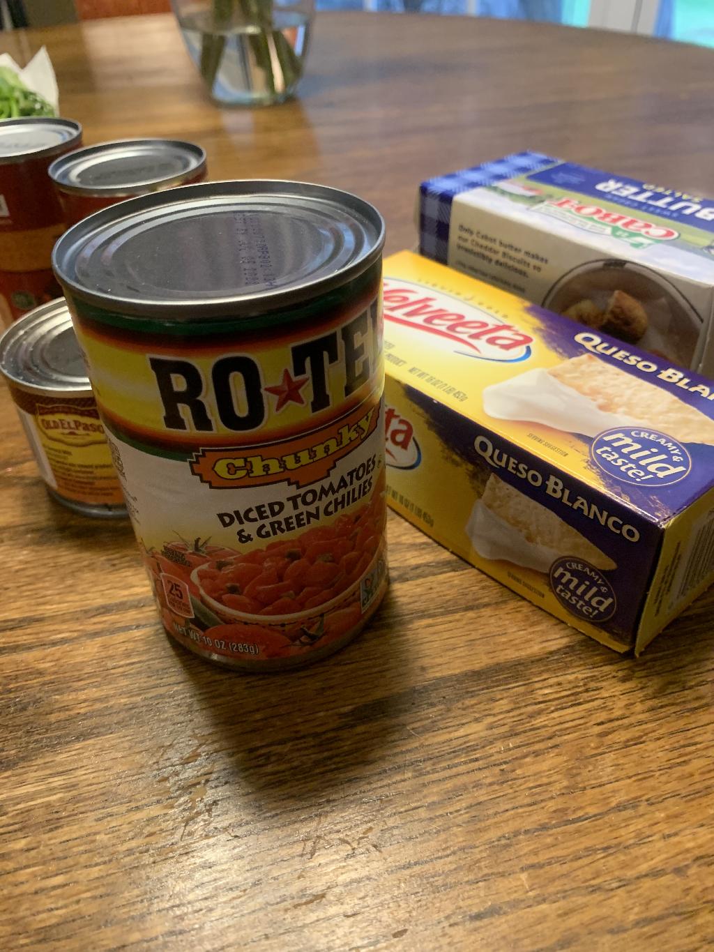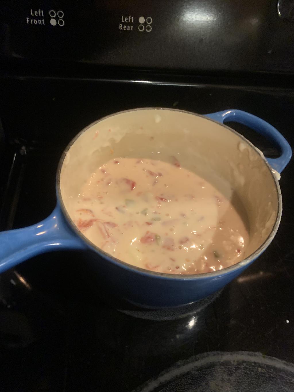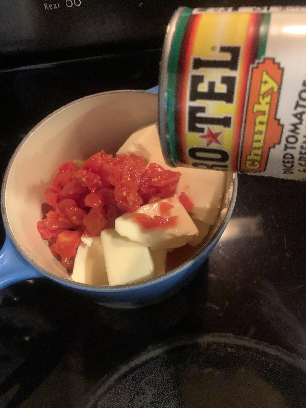 Step #3 Open the can of Rotel tomatoes and pour into sauce pot with cheese.