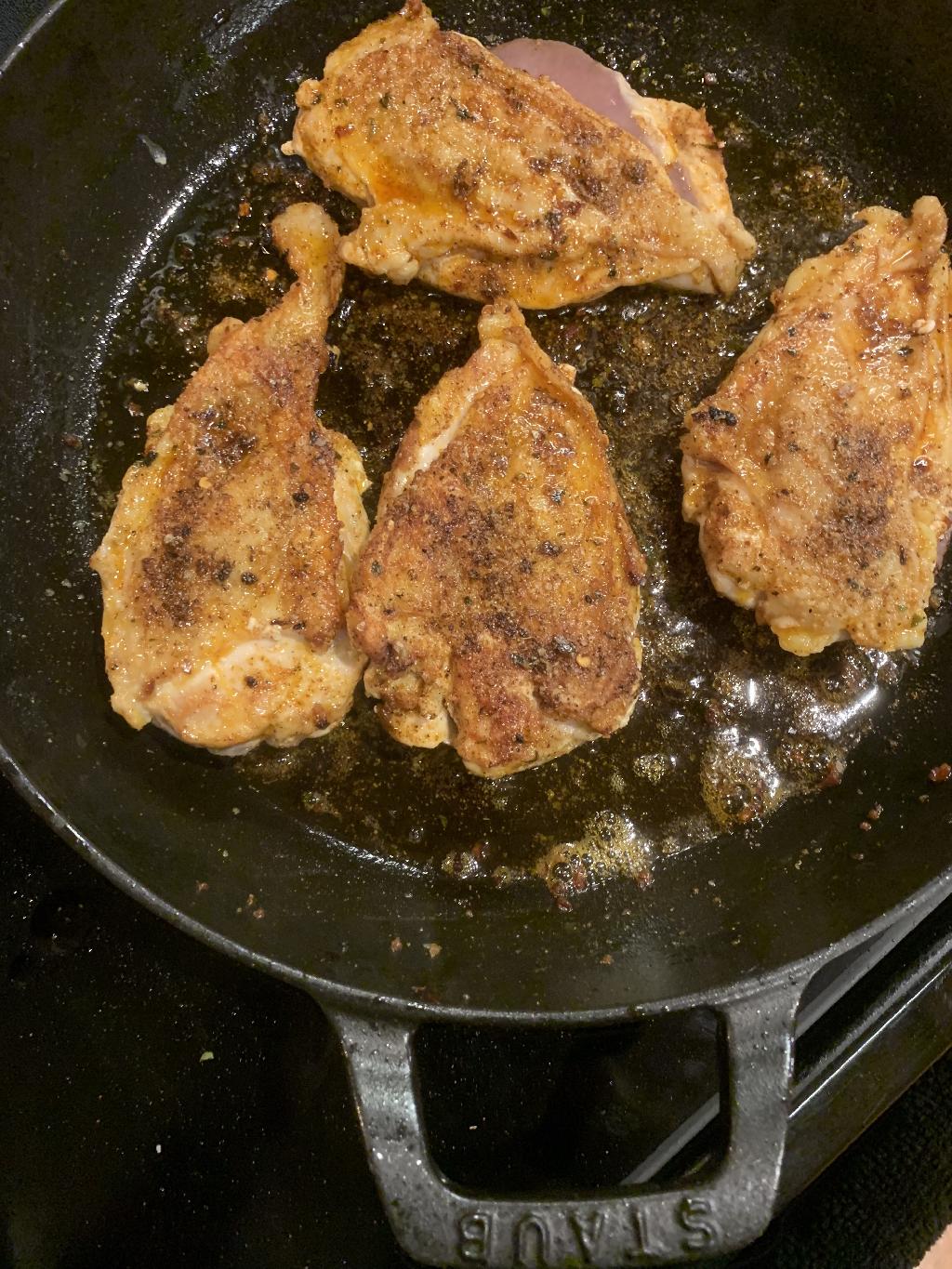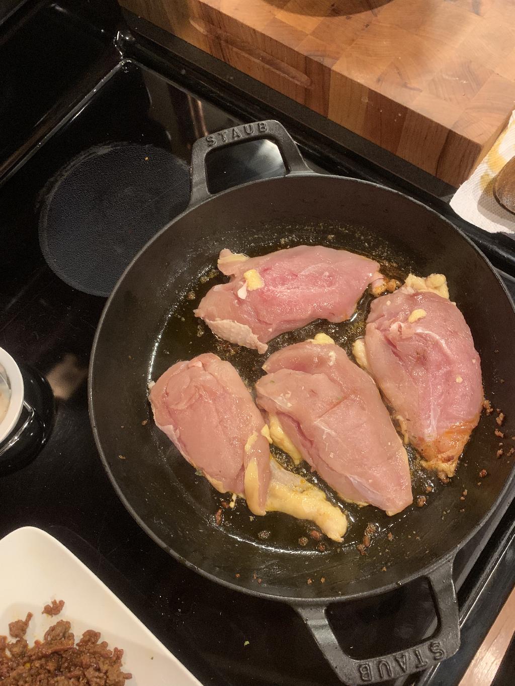 Step #8 Now lets cook our Pheasant Breast in the butter and Chorizo oil. Turn up the heat a little and give the skillet a minute to warm. Add Pheasant to hot skillet, skin side down. Allow to cook for 2-3 minutes. We just want to brown the skin really fast, not cook the Pheasant all the way through.