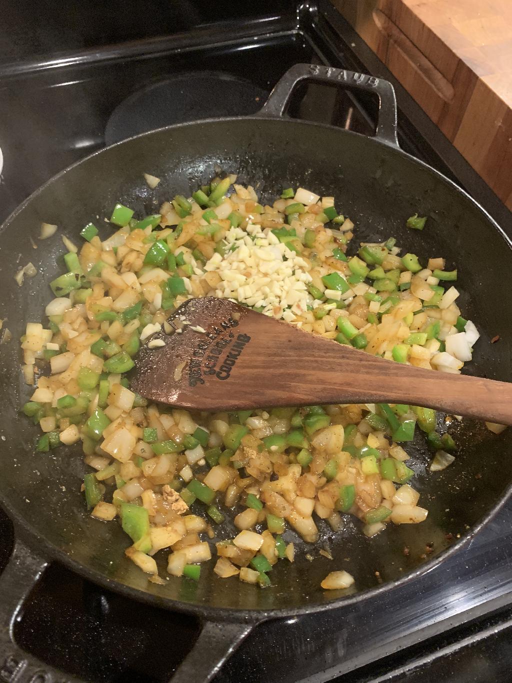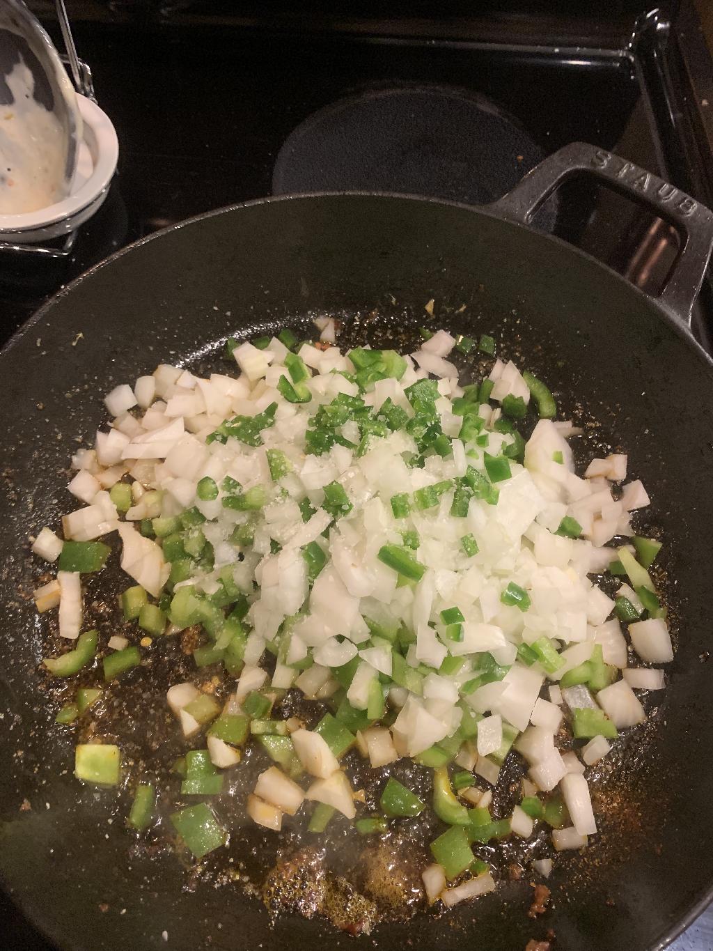 Step #11 Add Onions and Peppers to hot pan, sprinkle with Salt and Pepper and a little dash of the Mexican Seasoning Blend, then allow to cook for 5-7 minutes.