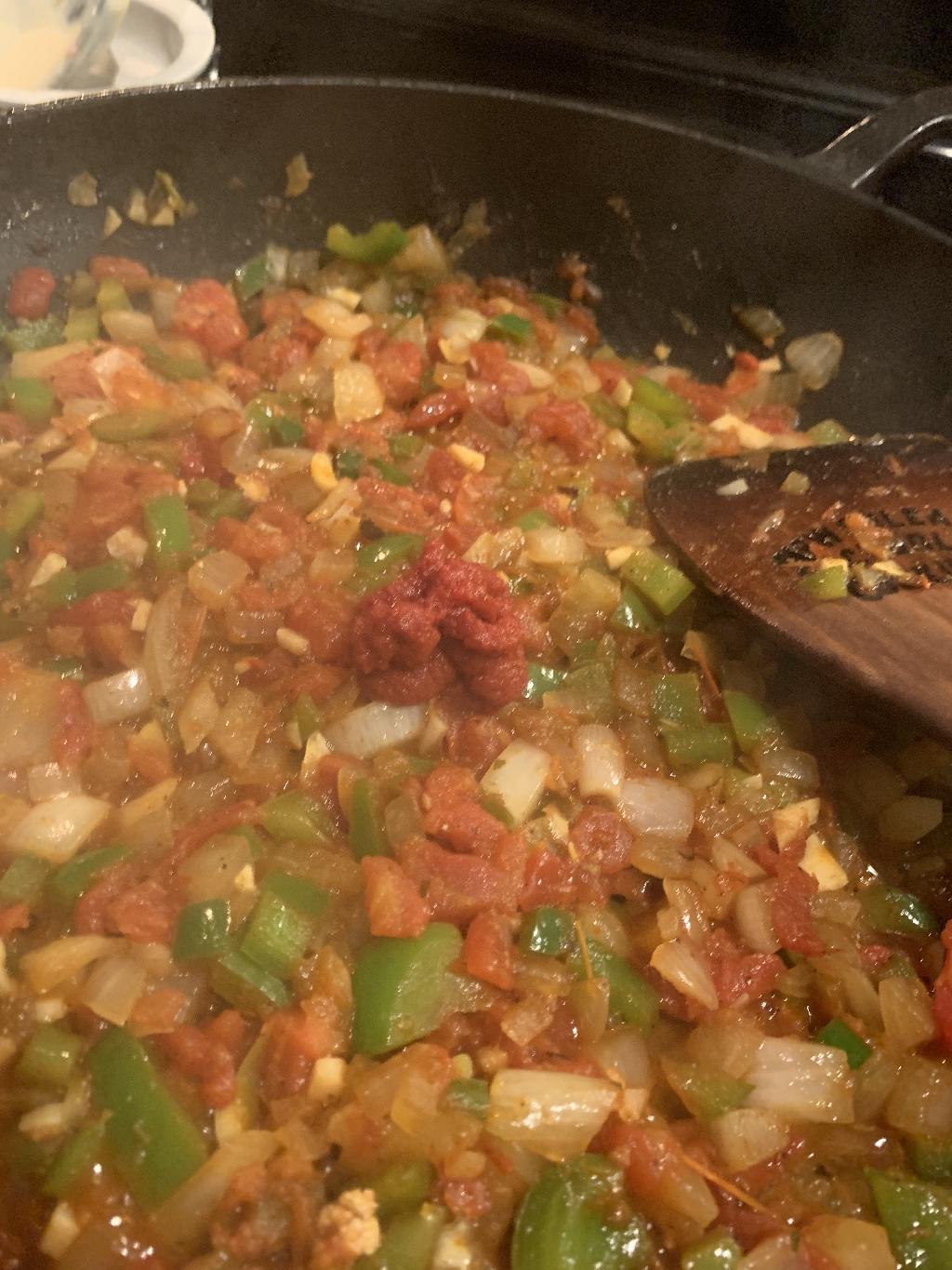 Step #14 Add one tablespoon of tomato paste, using a spatula to coat all the vegetables. Allow this to cook for a 2-3 minutes.