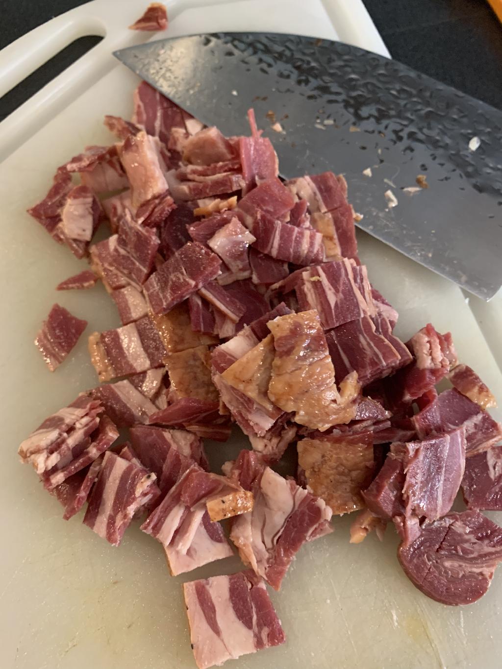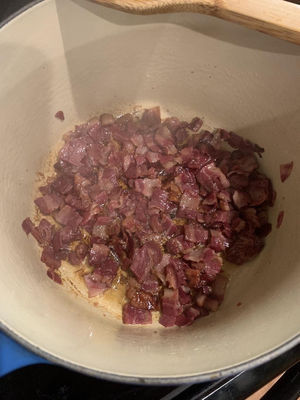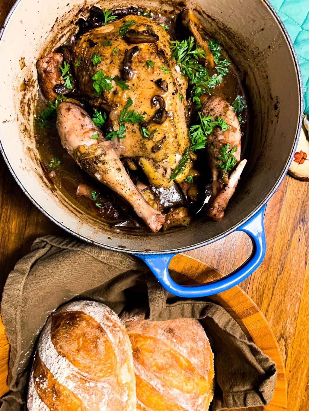 Often times, I'll look at my list of food ideas and realize that I already have the ingredients to make something that's on it ... and that's kind of what happened here. It was time to harvest some of the Onions, Carrots, Garlic and Thyme I'd been growing in my tiny backyard garden, so I was trying to figure out what I could do with all this stuff I grew. That's when I realized, it was time to stop planning to do this Coq Au Vin and just do it. To me, this Coq Au Vin was the perfect harvest recipe for my little garden produce. Since most of the vegetables I used in it can be either winter or summer crops, late spring or fall seems like the perfect time to make this meal, as you gather fresh produce from your own garden. I even used a homemade Cabernet Sauvignon, that me and wife made in the garage. Of course, you don't have to make your own wine to make this recipe, any store bought dry red wine will work. I also used some Wild Hog bacon in this recipe, that you can substitute that with regular Bacon, Guanciale or Pancetta.