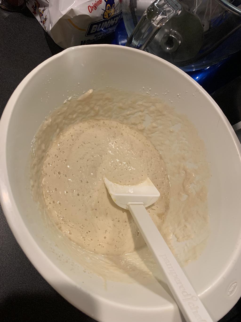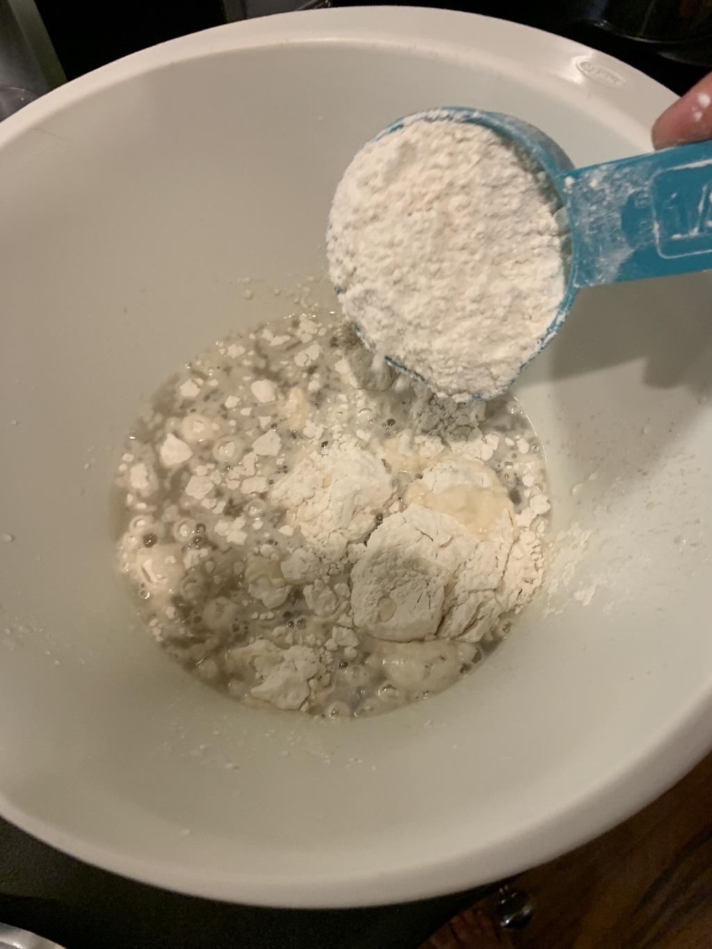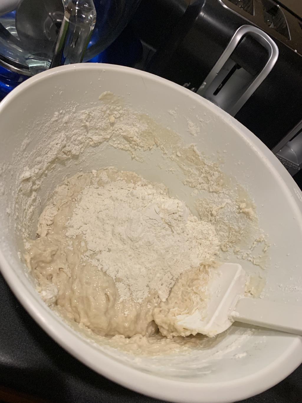 Step #3 Add 2 1/2 to 3 cups of All Purpose Flour, one half cup at a time to your proof, using a spatula combine. When you get the desired consistence, something not to loose, stop adding flour.