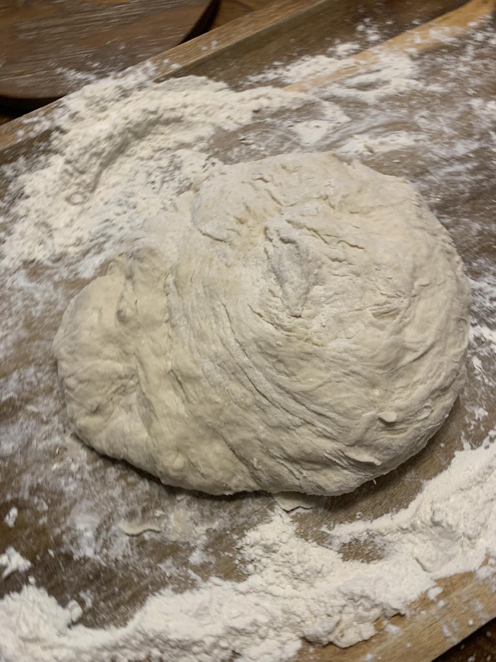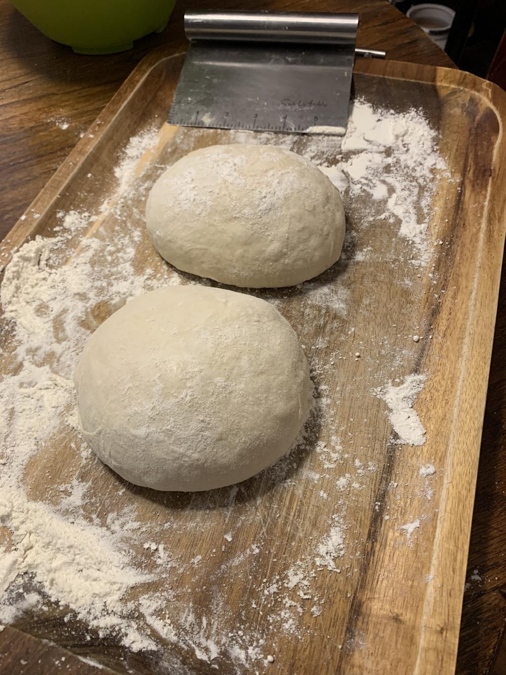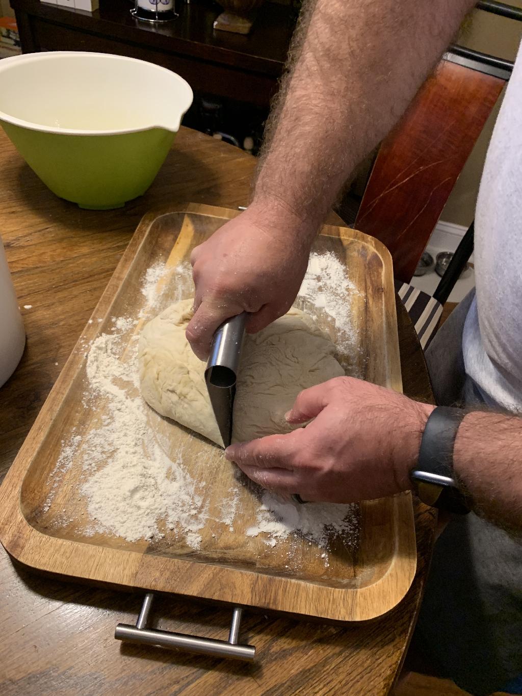Step #9 Preheat oven to 450. Pour the dough out onto well-floured surface and using a knife or food scrapper, divide the dough in half.