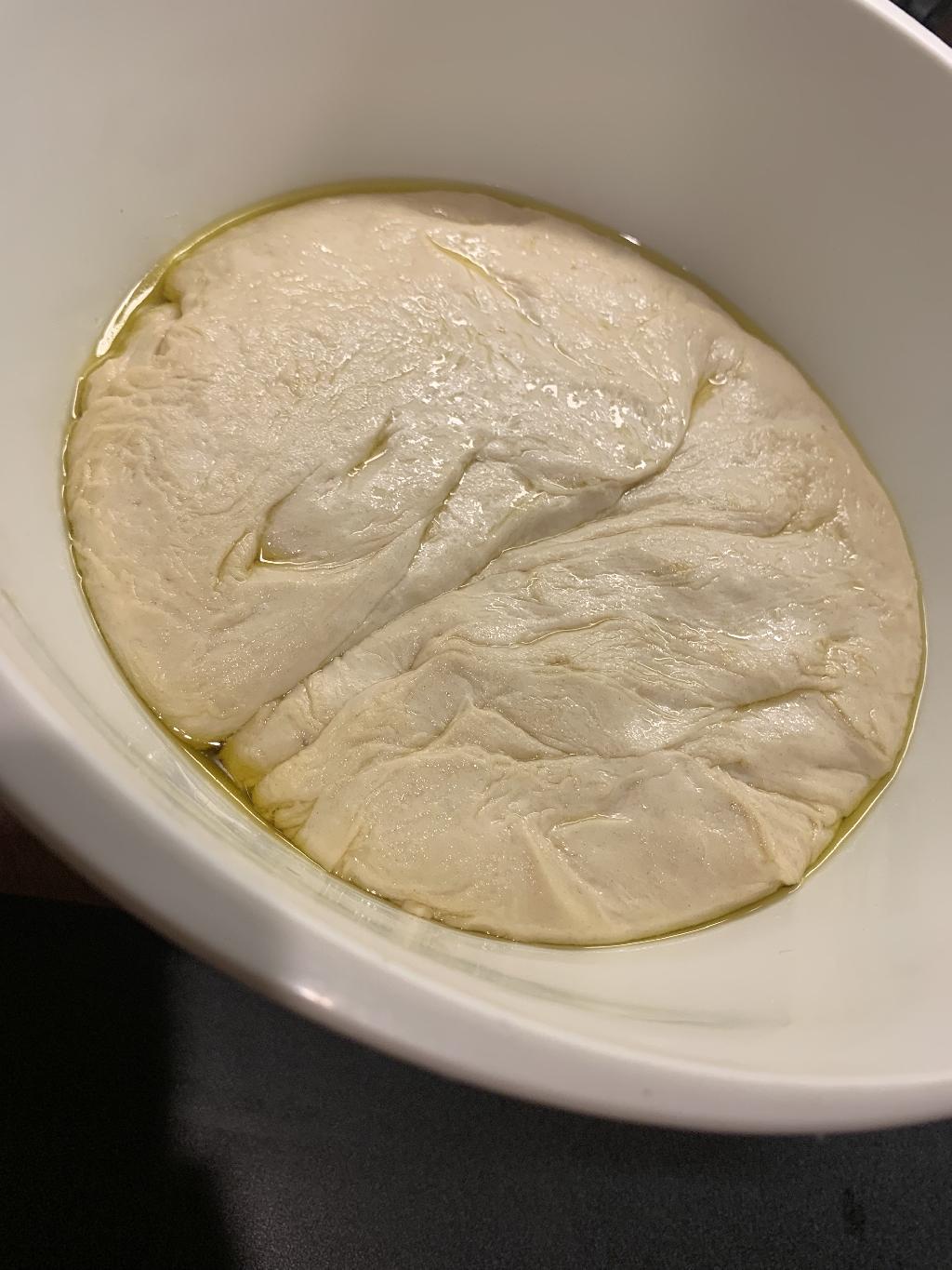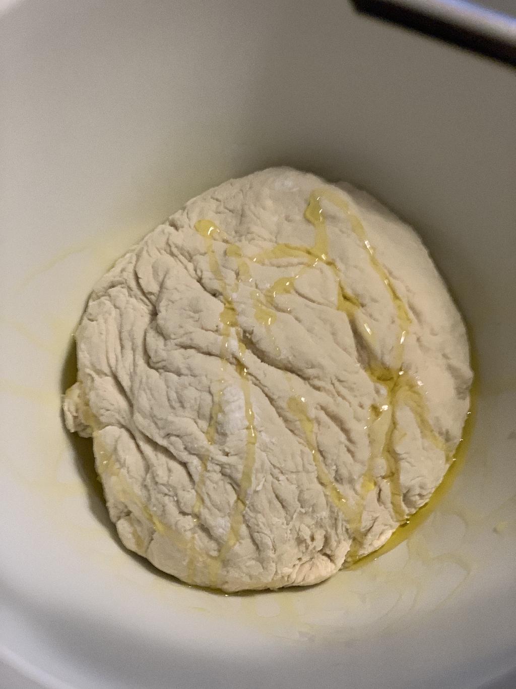 Step #6 Pour a little olive oil into a large bowl and allow it to coat the edges of the bowl, add dough then drizzle a little olive oil over the top.