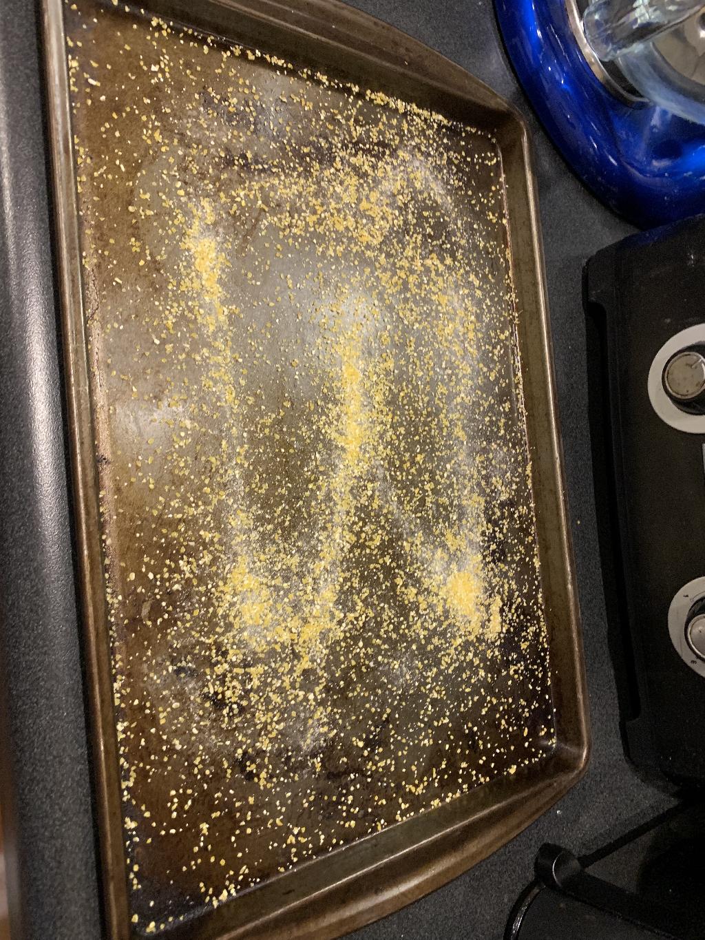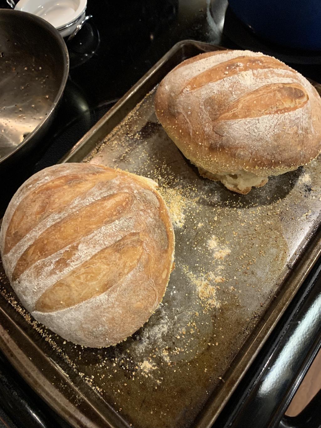 Step #14 Fill a small oven proof tray or loaf pan with water and place it on the lower rack of the oven. This will create steam, helping the bread form its outer crust. Give it 10 or 15 minutes to get nice and steamy, before placing your baking sheet on the top rack. Before careful open the oven as the steam will escape in your face. Bake for 20-25 minutes. Remove from oven and allow to cool.