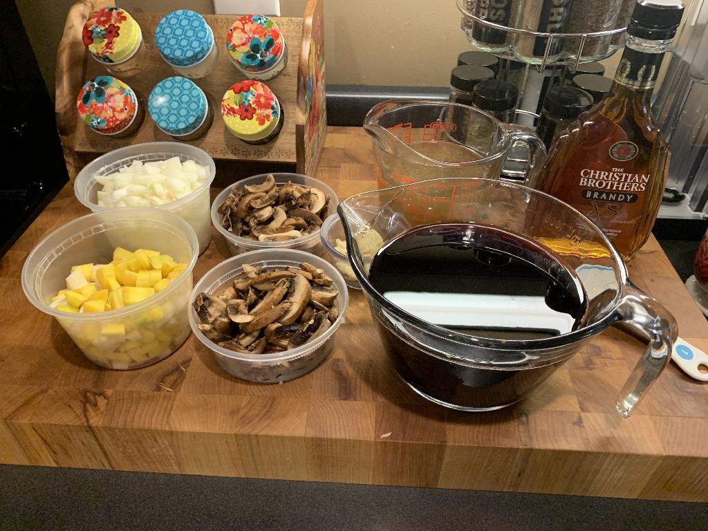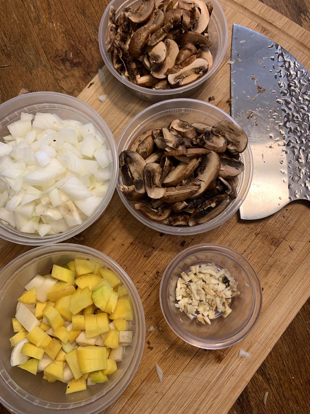 Step #2 Chop Onions, Carrots, Garlic and Mushrooms, ensuring to divide Mushrooms into two different containers.