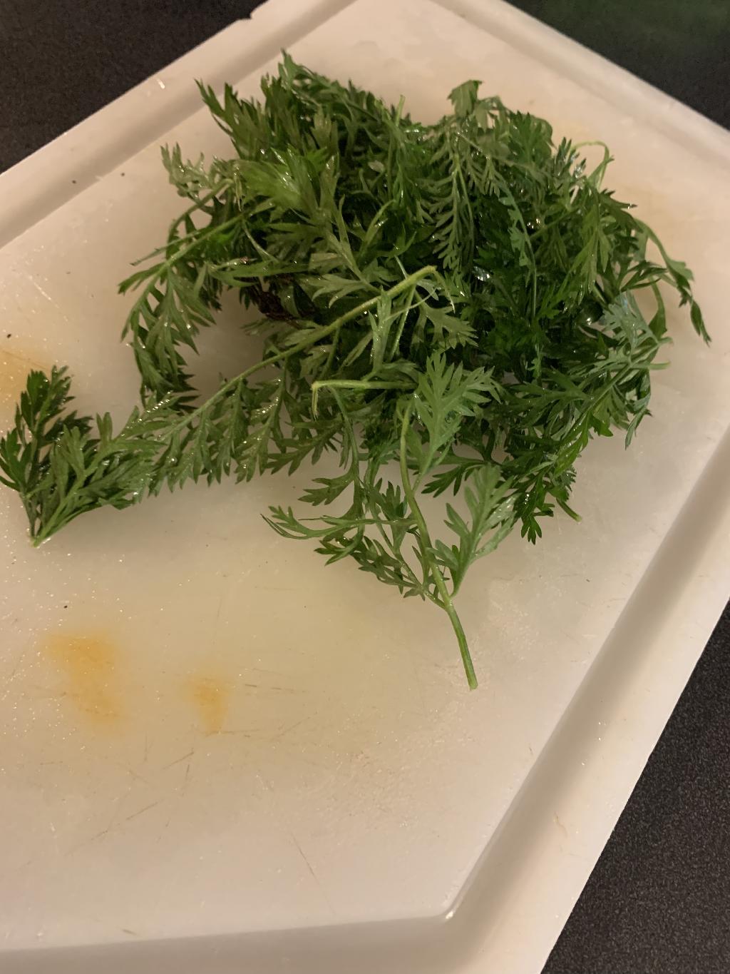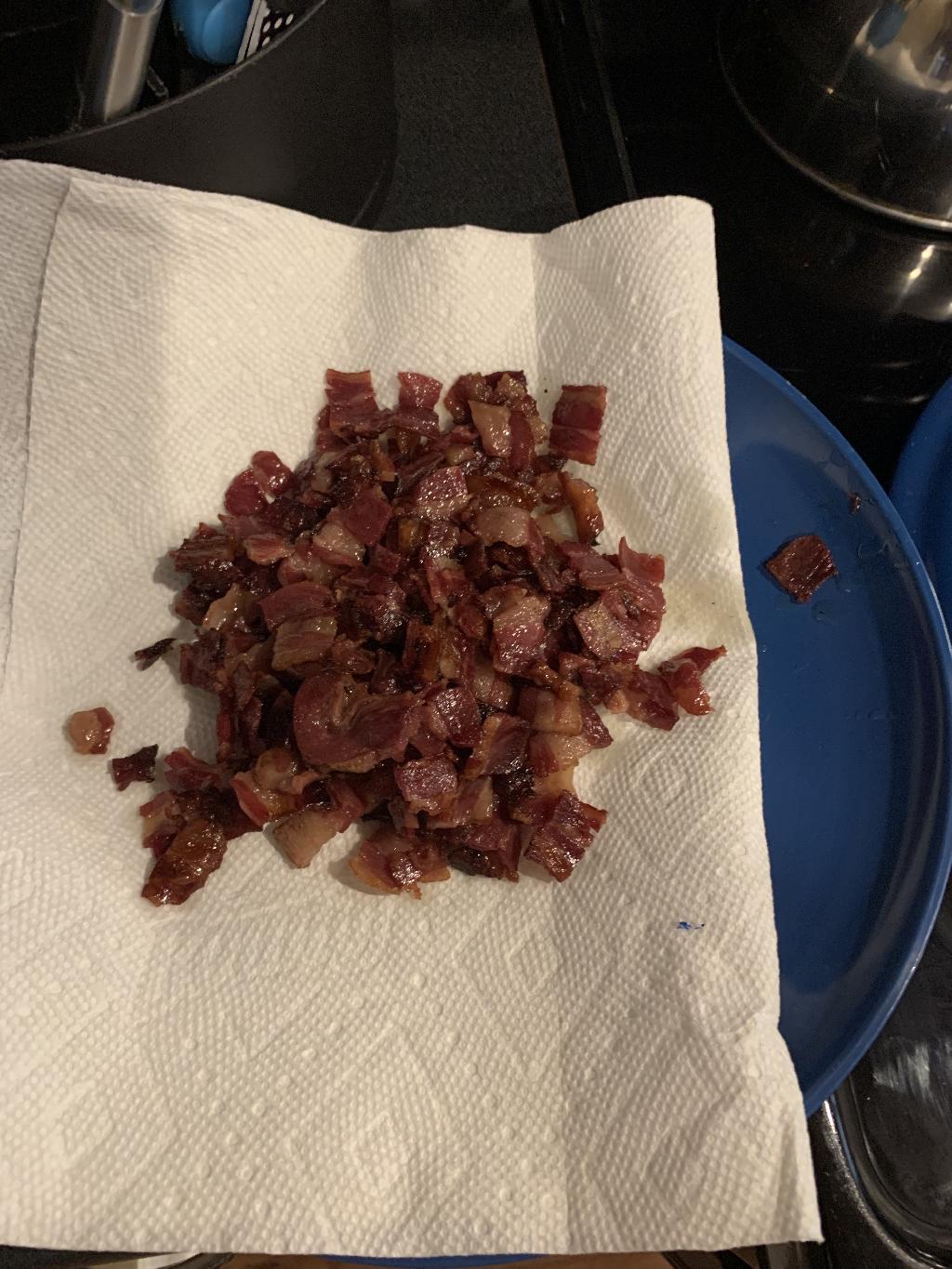 Step #37 Add chopped carrot tops, bacon and crispy mushrooms as a garnish.