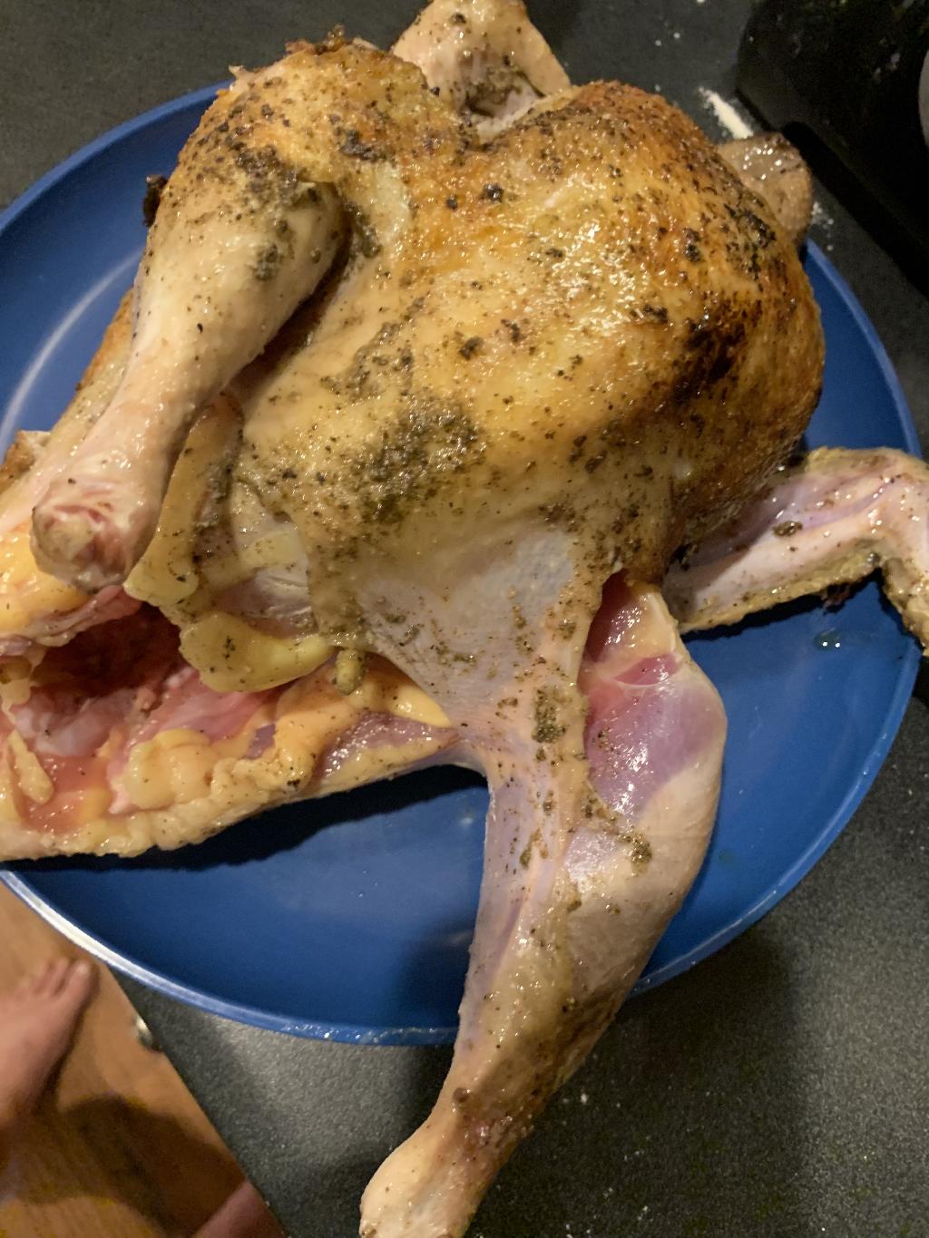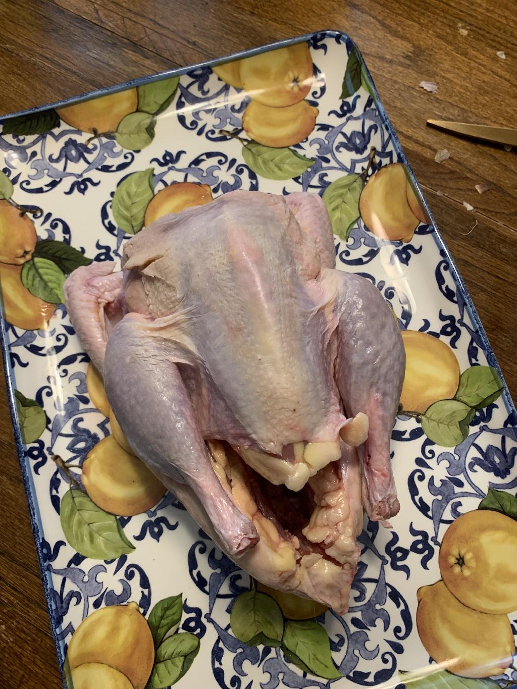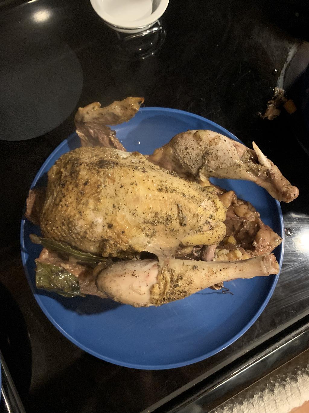 Step #28 Remove Pheasant to plate or bowl. Be very careful moving Pheasant, it will be tender and will fall apart easily. I used two utensils, sticking a long spoon into the birds cavity and using another underneath the bird to lift it out.