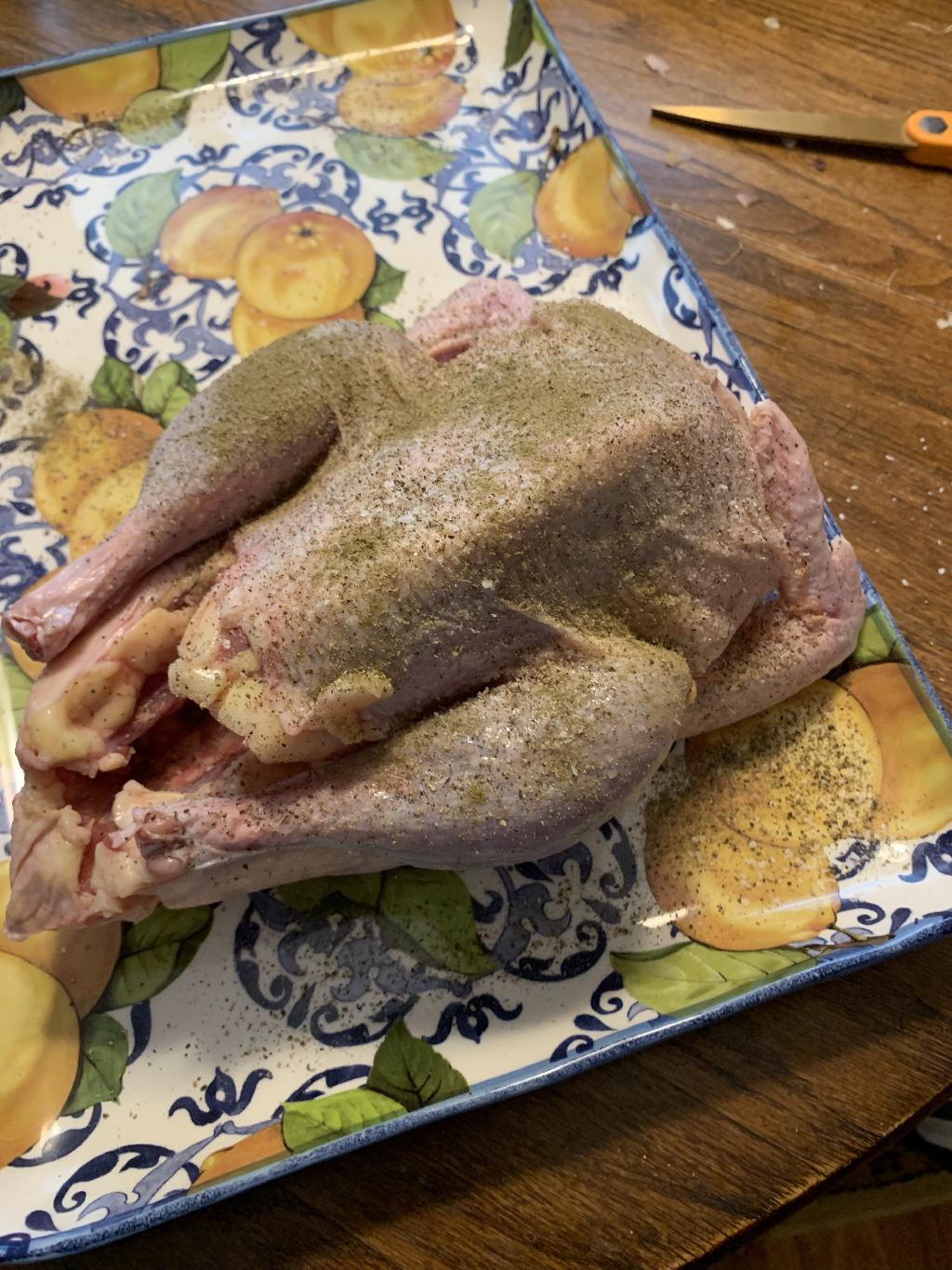 Step #11 Sprinkle pheasant all over with salt, pepper and ground thyme, including the cavity.