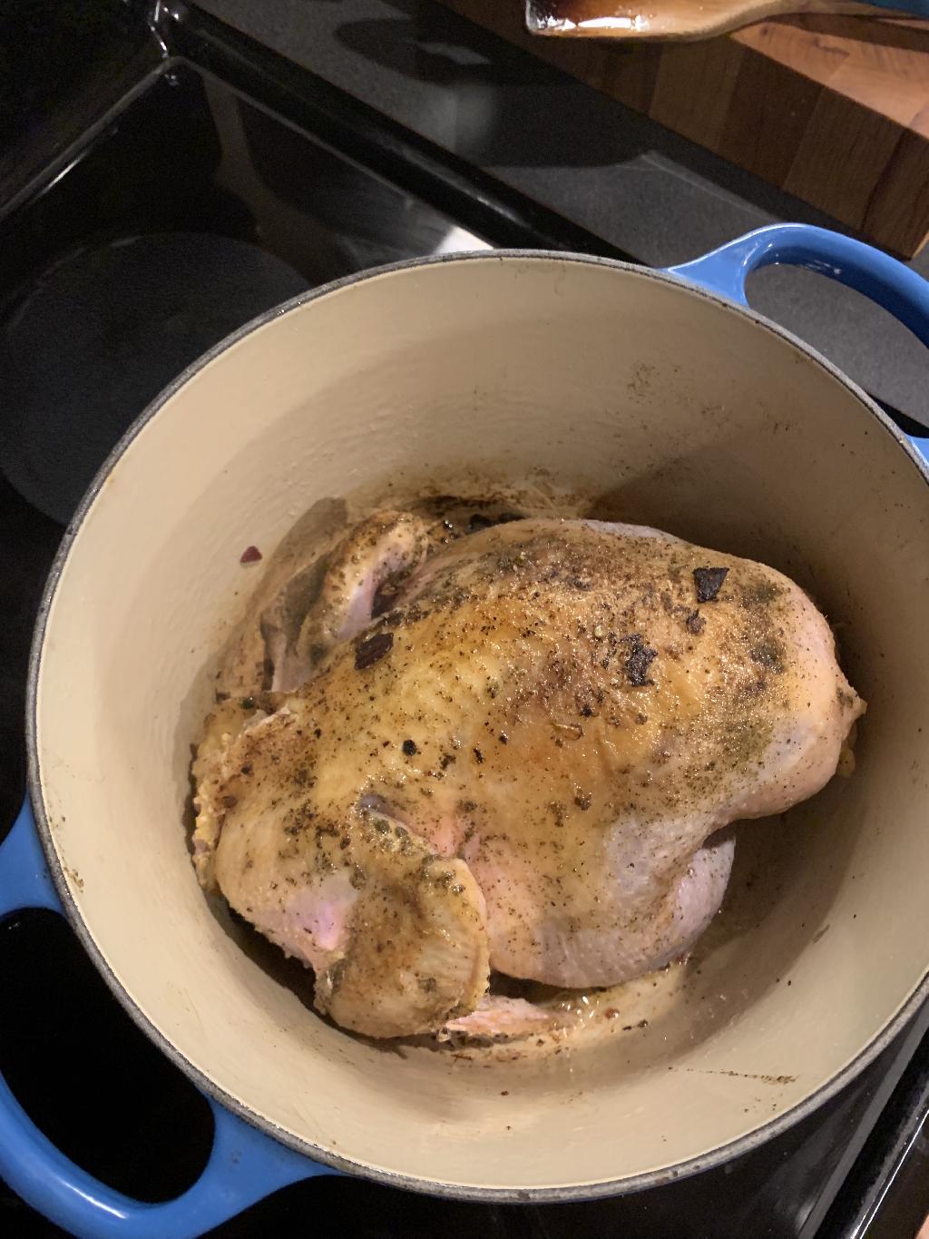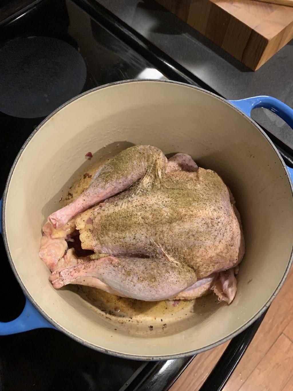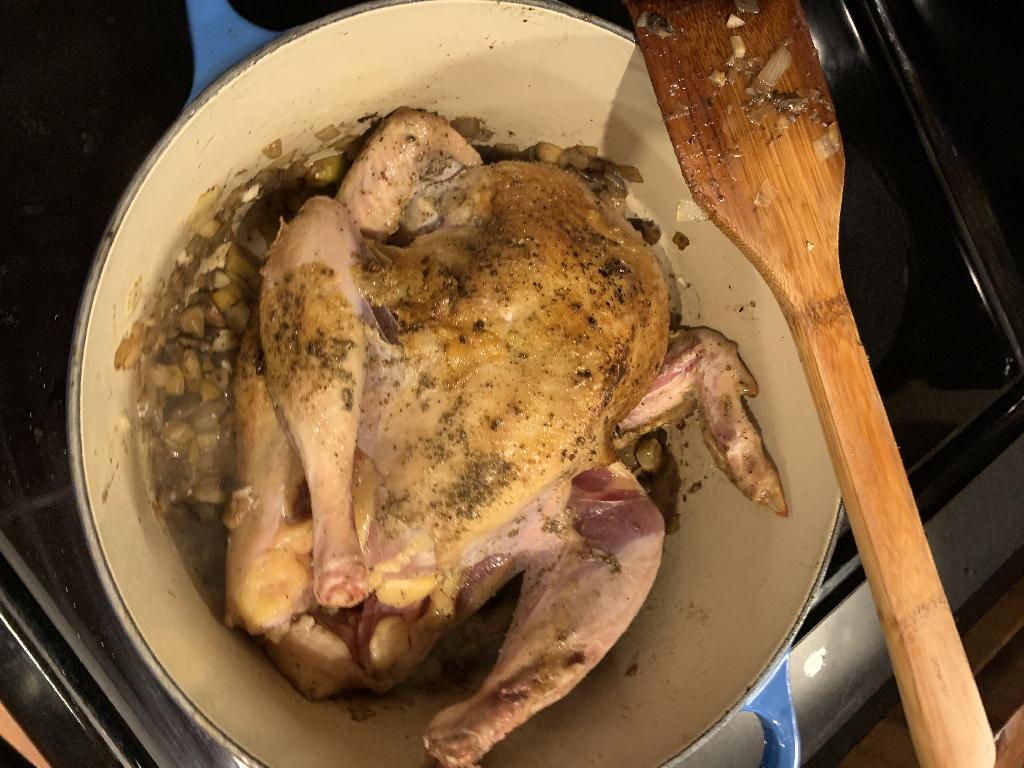 Step #12 Add whole pheasant to hot Dutch oven, so it can start browning in the rendered bacon fat.