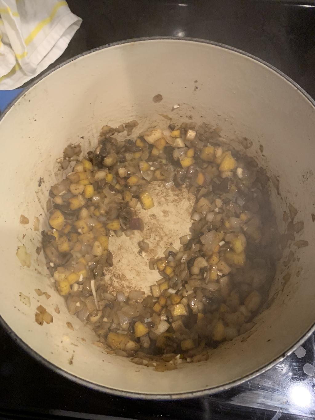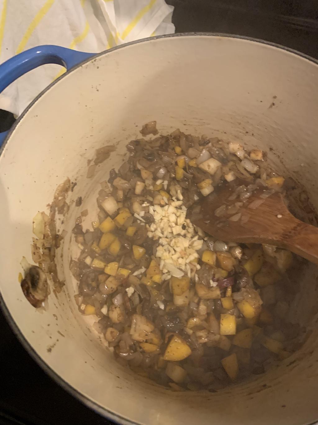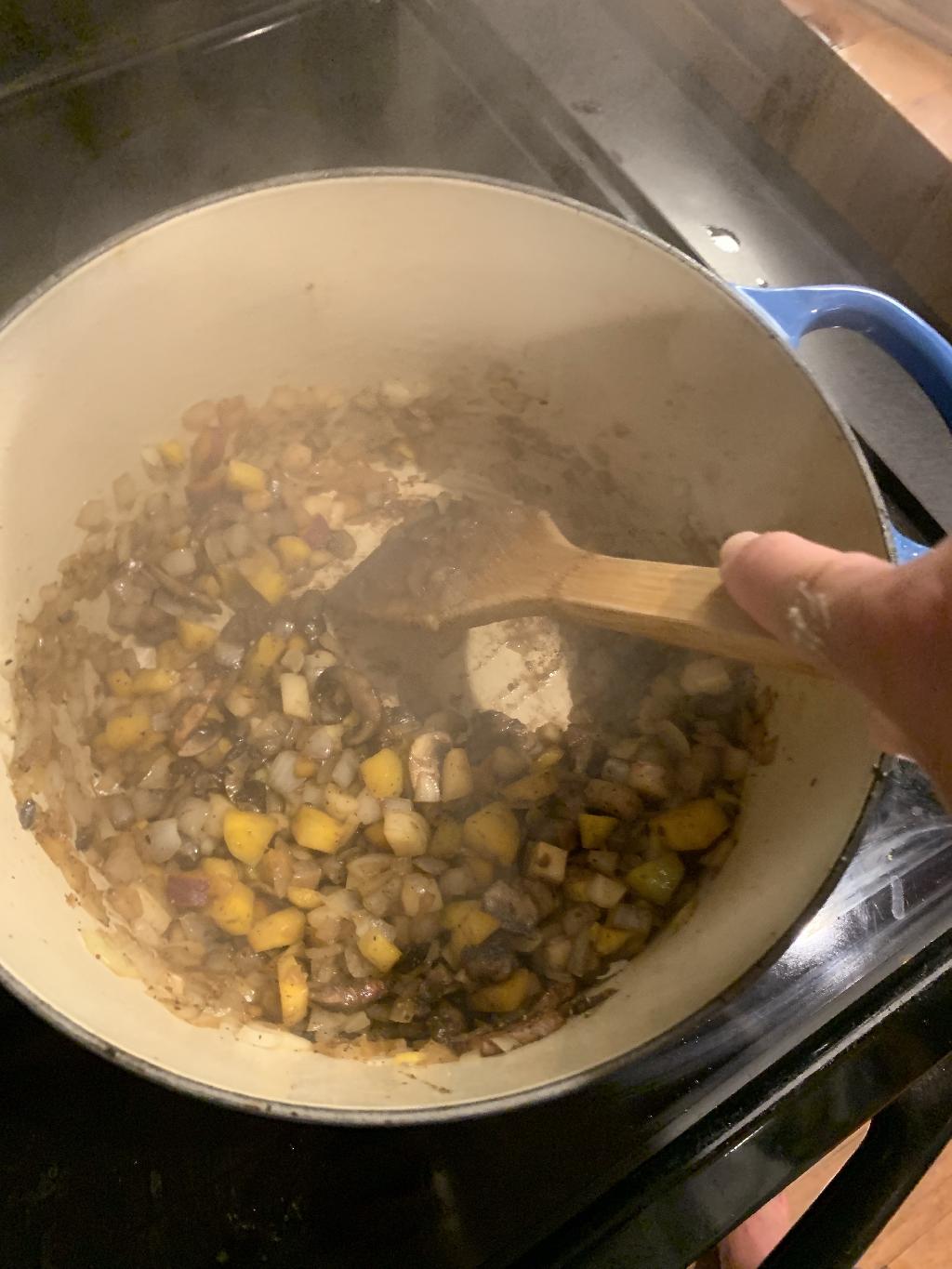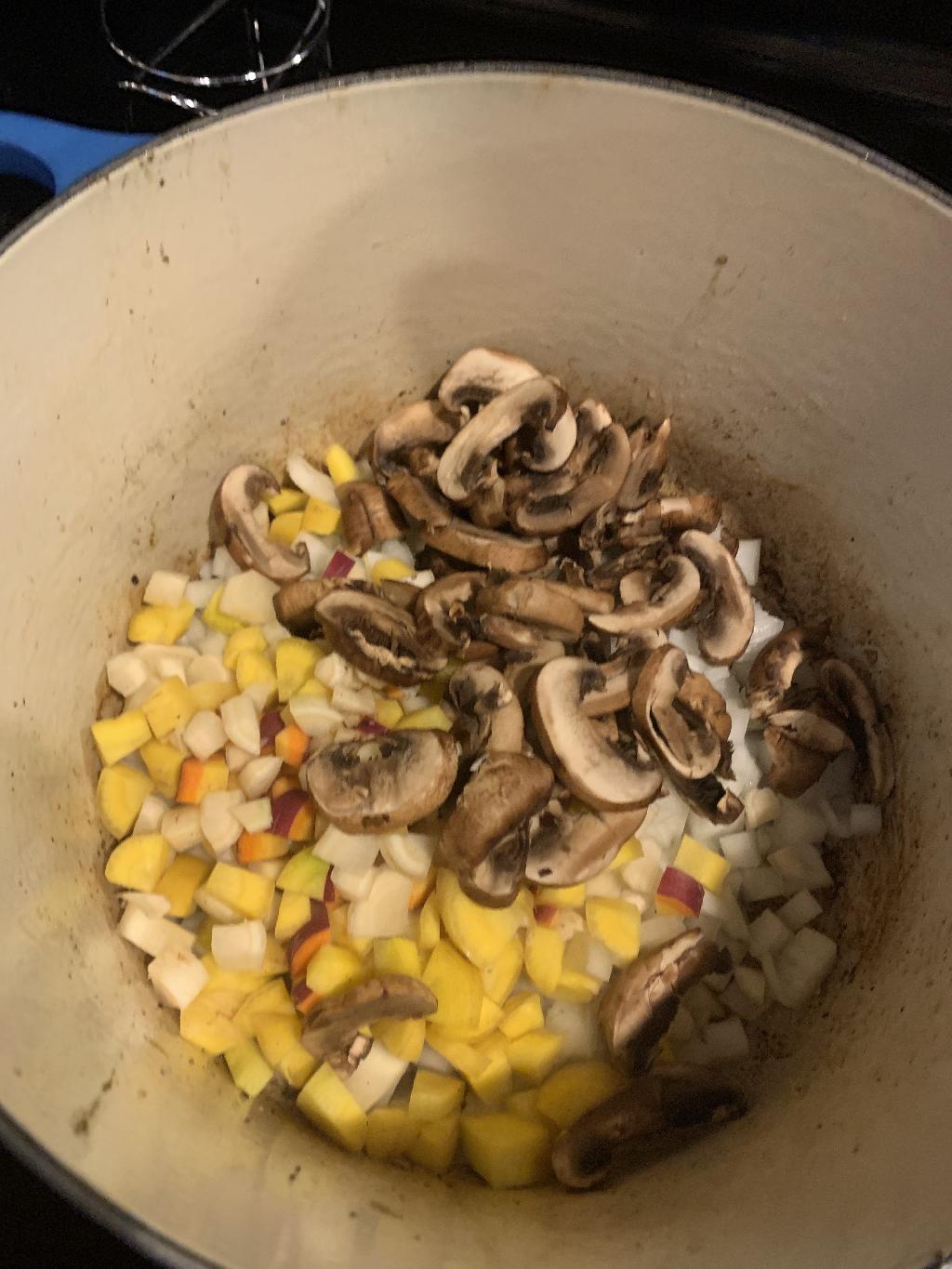 Step #15 Add onions, carrots and half the mushrooms to the Dutch Oven.