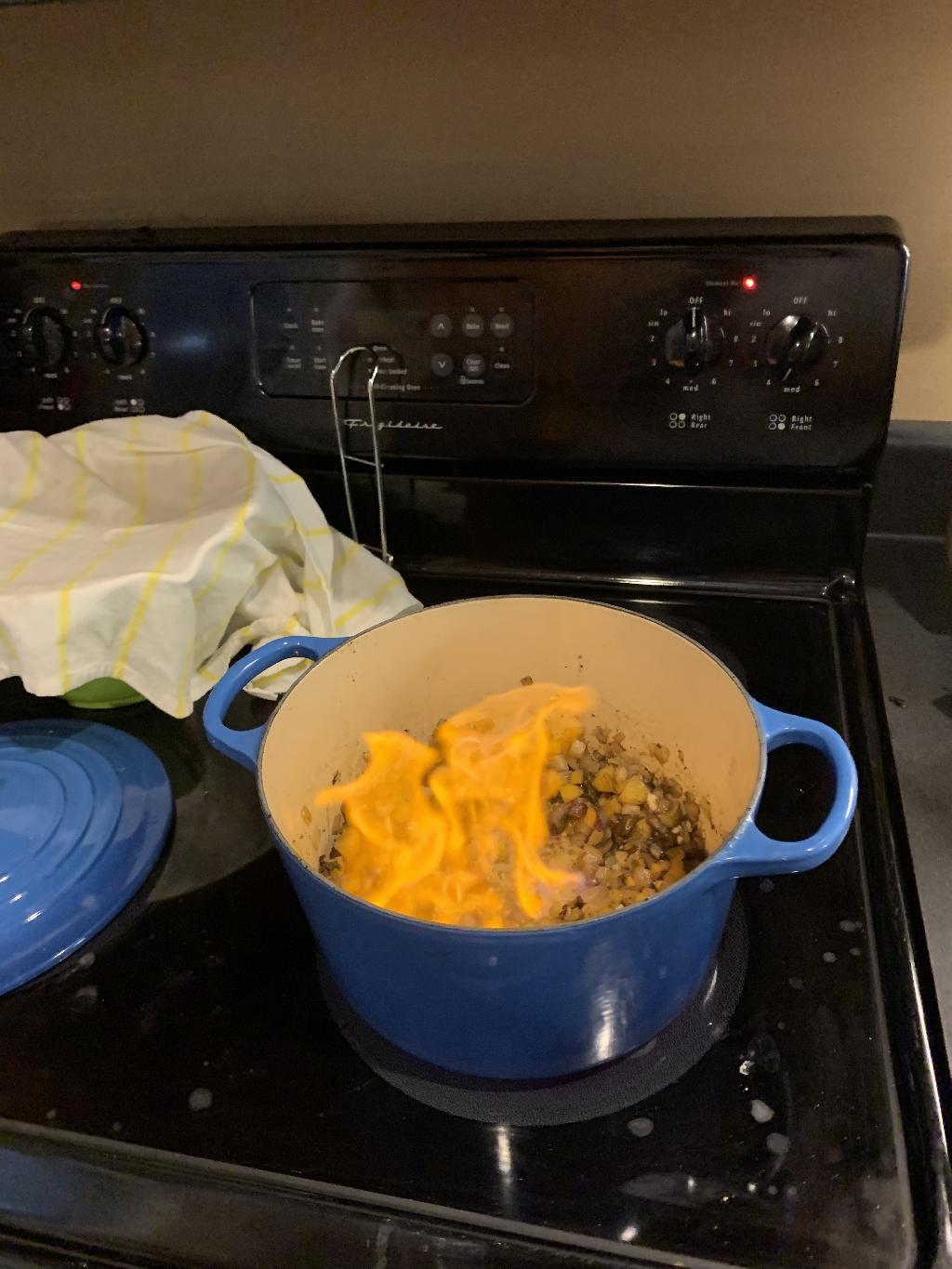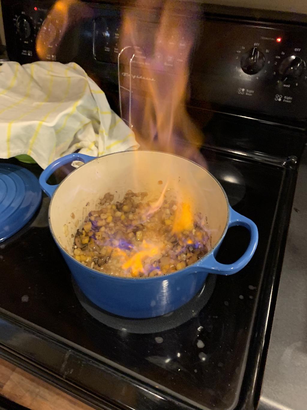 Step #20 Light the Brandy with lighter. Making sure everything is clear of the dutch oven. This will burn itself out pretty quickly.