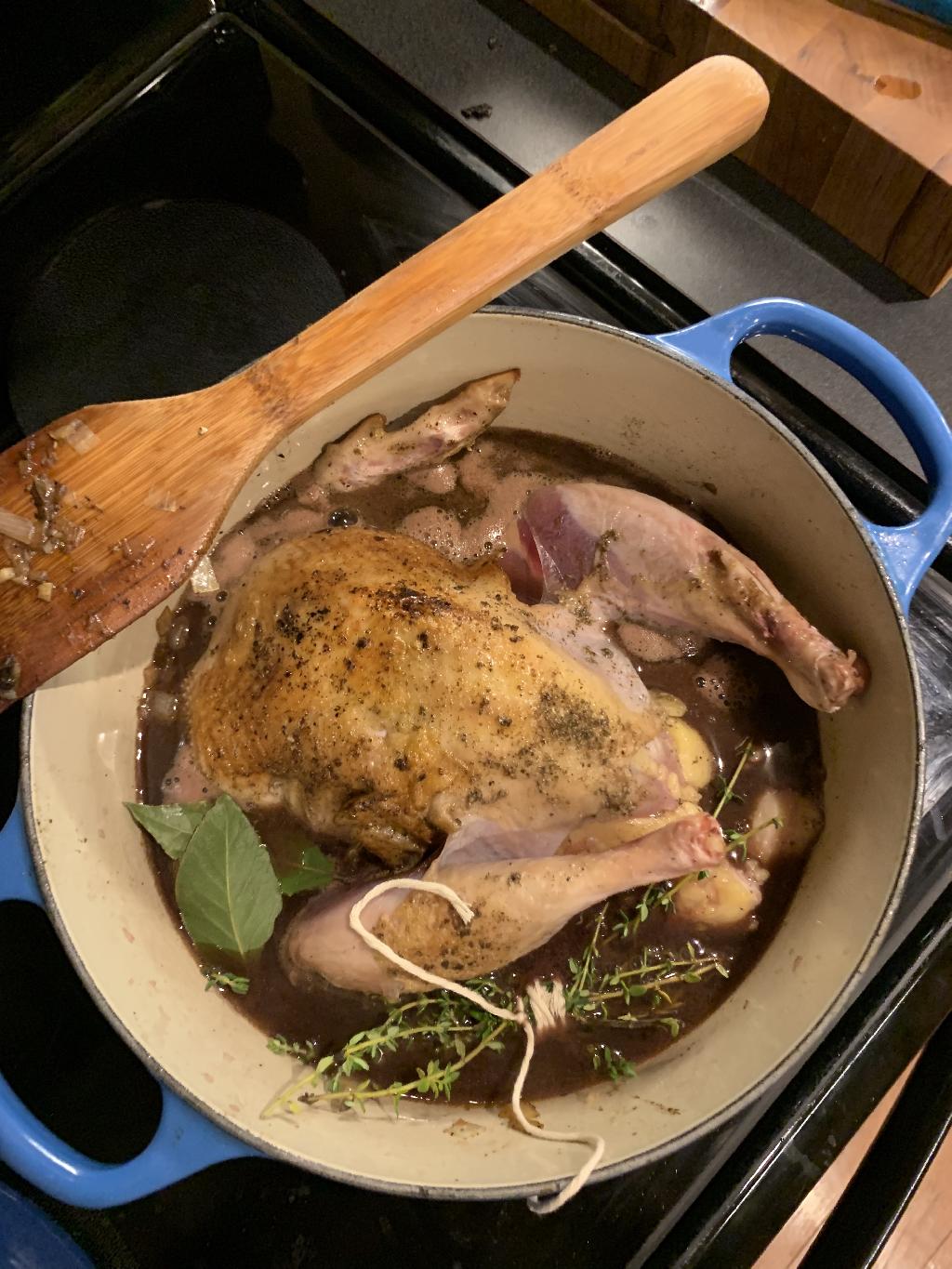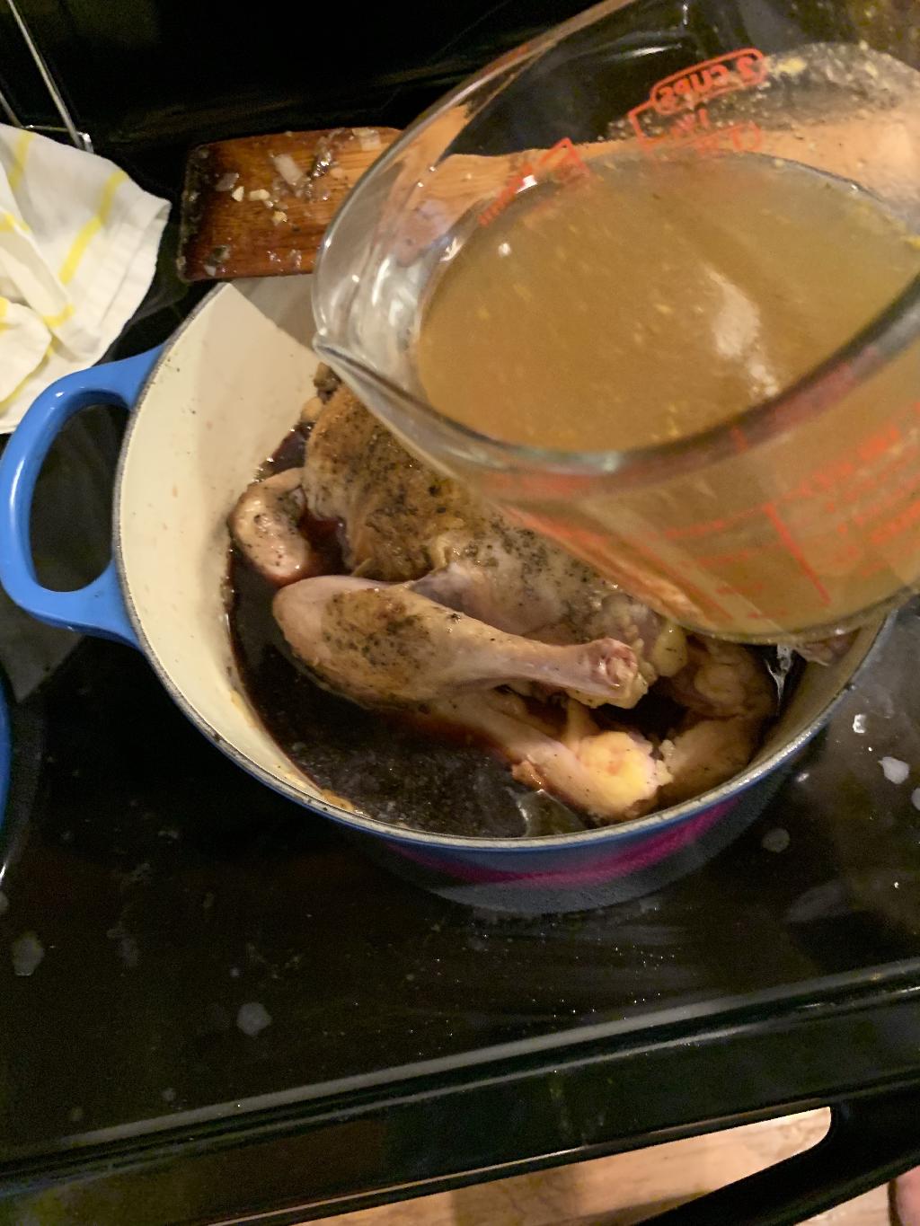 I originally just planned on using pheasant leg quarters to do this recipe, I know the legs can have a lot of sinew in them but braised in this liquid for a long time would have made for a pretty tasty meal. I decided to just try to use the whole pheasant, after all it fit perfectly in my Dutch oven. My major concern was overcooking the breast meat waiting on the legs and thighs to cook, but that really didn't turn out to be a problem. I think having the lid left off my Dutch oven and not having the bird fully submerged in liquid, help even out the cooking process and let some of the liquid reduce down. The whole thing turned out prefect, although my presentation wasn't exactly what I was looking for, it was delicious! The meat literally just fell off the bones, even some the bones, simply broke in half while cooking. Serve this with some good old crusty white bread to sop up that sauce and you'll think you died and went to food heaven!