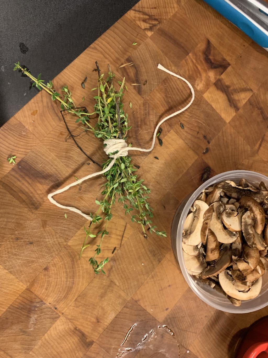 Step #25 Tie the Thyme sprigs together with butchers twine. This will make it easier to remove after cooking.