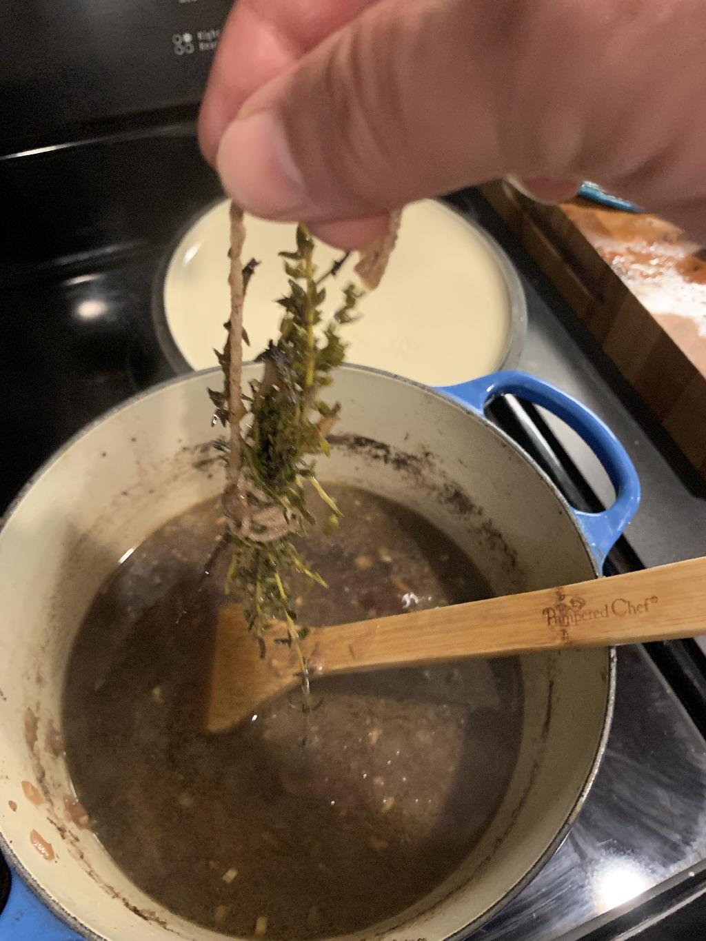 Step #26 Add Thyme and Bay Leaves to Dutch Oven.