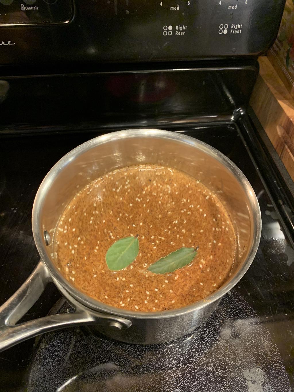 Step #1 Add two cups of water to a small sauce pan. Add salt, brown sugar, Turkish seasoning mix and bay leaves. Bring to a boil, then reduce to a simmer. Let simmer for ten minutes.