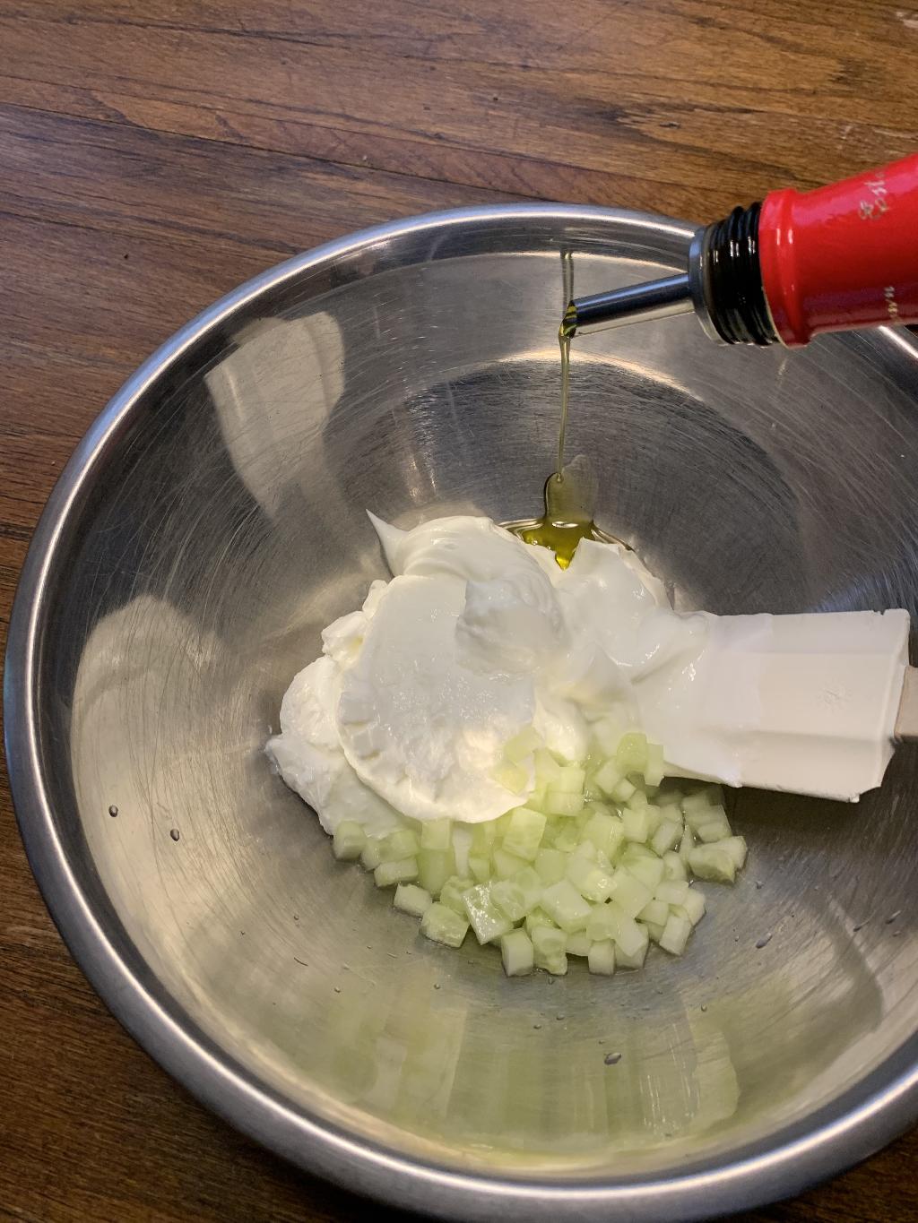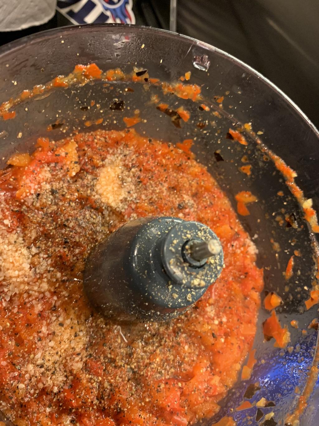 Step #8 Turn the food processor on and let run for half a minute, drizzling in a little olive oil while it runs.