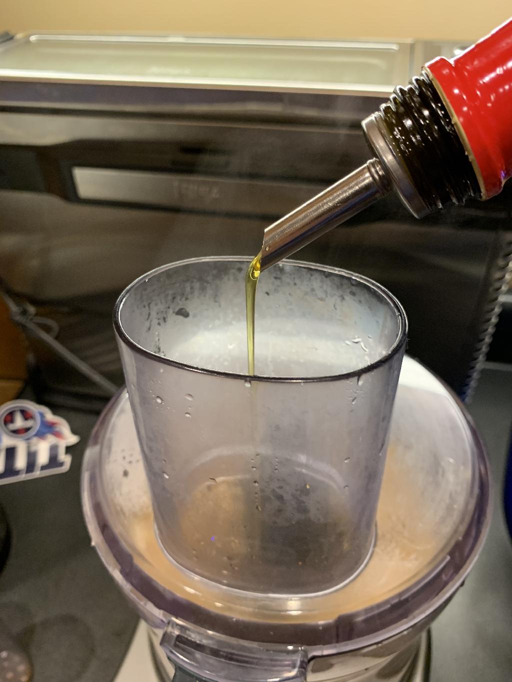 Step #9 Drizzle in a small amount of Olive oil. Then pulse on high setting a little more.