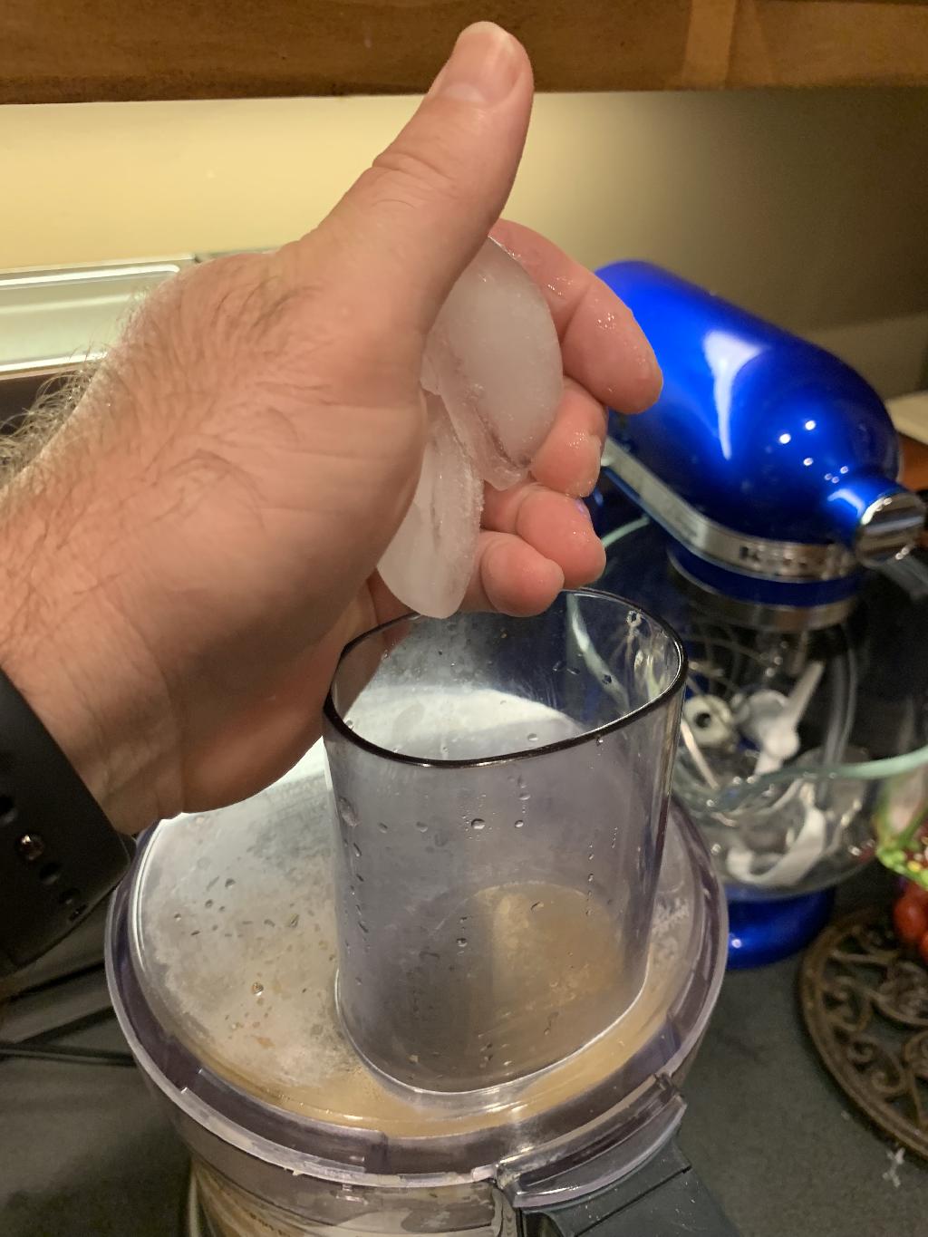 Step #10 Turn the food process back on for another minute, this time, drop in a couple of ice cubes.