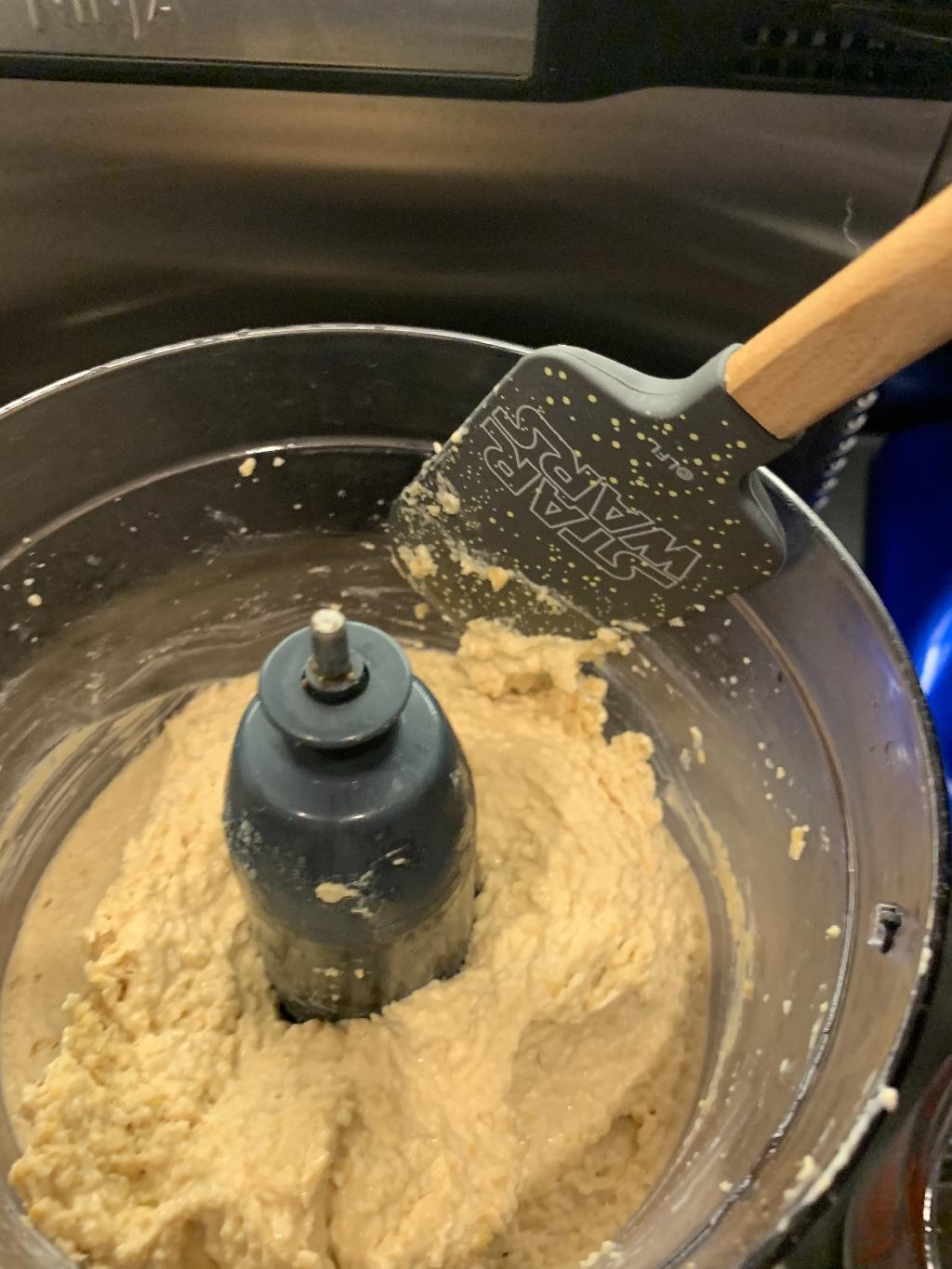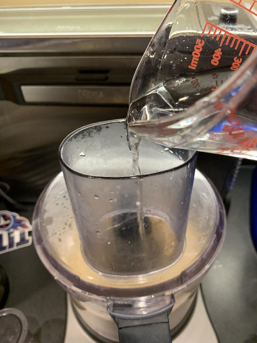 Step #14 Turn the food processor back on, this time drizzle in a little cool water.