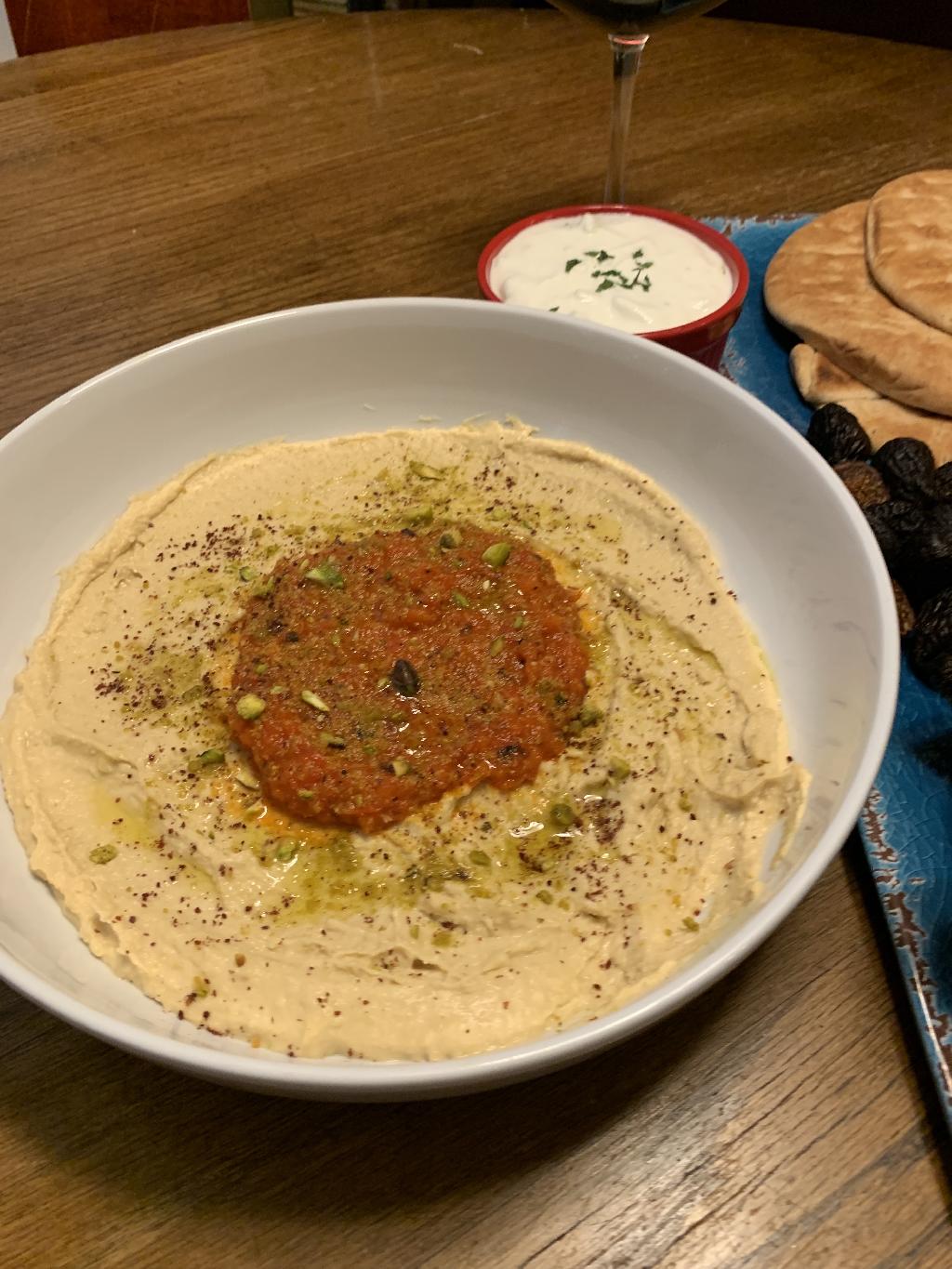 Step #17 Add a few spoonfuls of the Roasted Red Pepper paste to the top of the hummus. Sprinkle with chopped Pistachios and Ground Sumac.