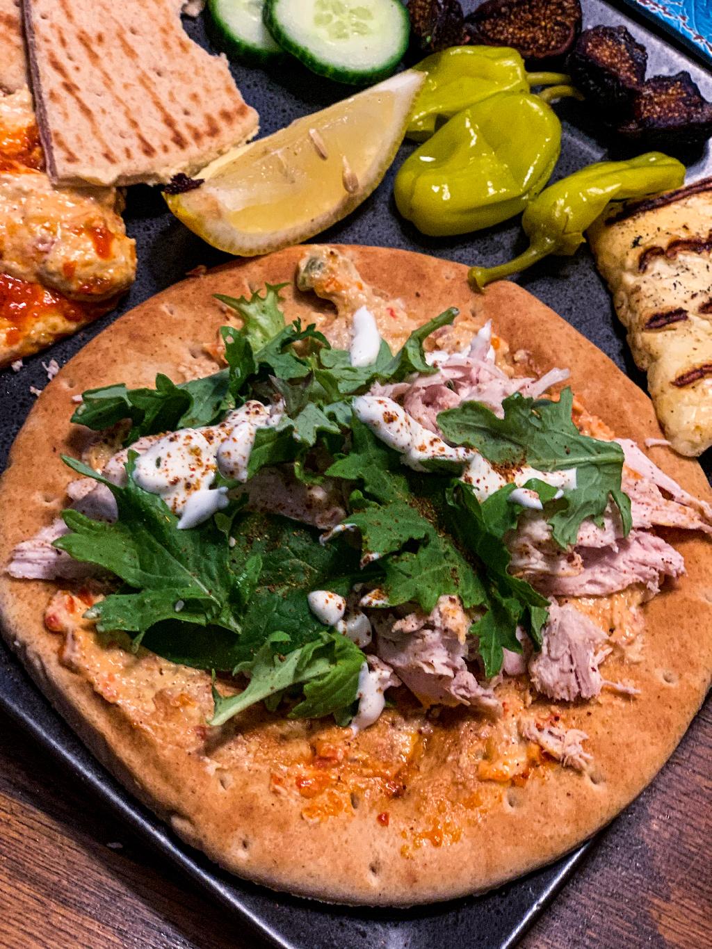 Step #8 Shave the Pheasant meat off onto a piece of pita bread. Top with fresh arugula, Tzatziki or Roasted Red Pepper Hummus.