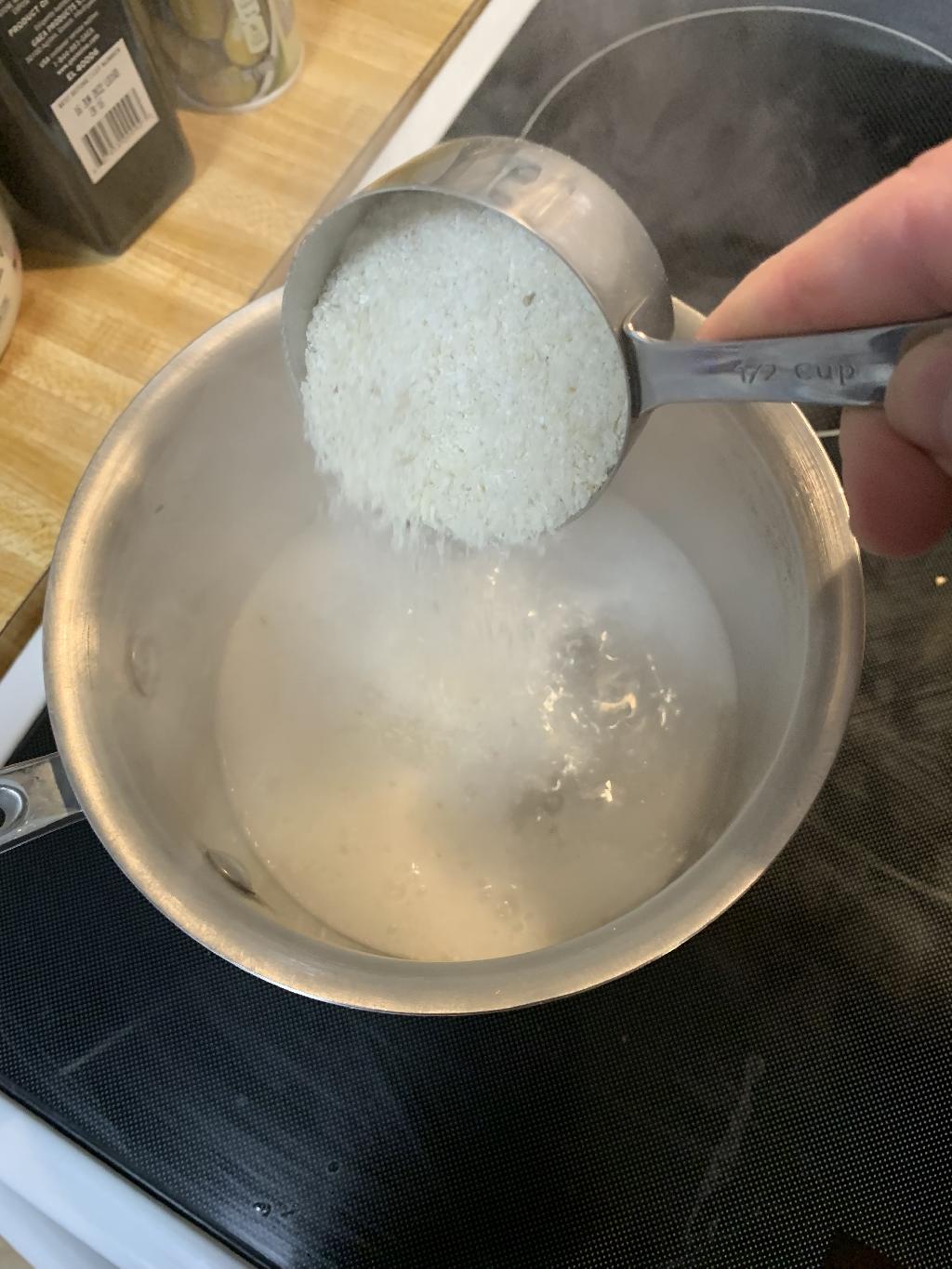 Step #2 When water reaches a boil, slowly add in grits, using a whisk to combine.