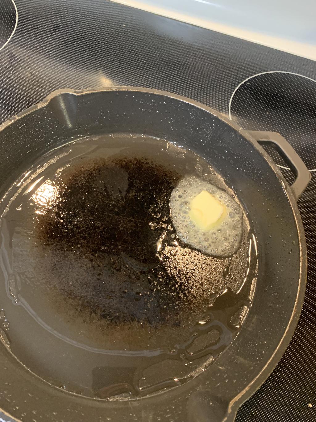 Step #1 Add one tablespoon of butter to a cast iron skillet, setting heat to medium high. Allow butter to melt and start to brown