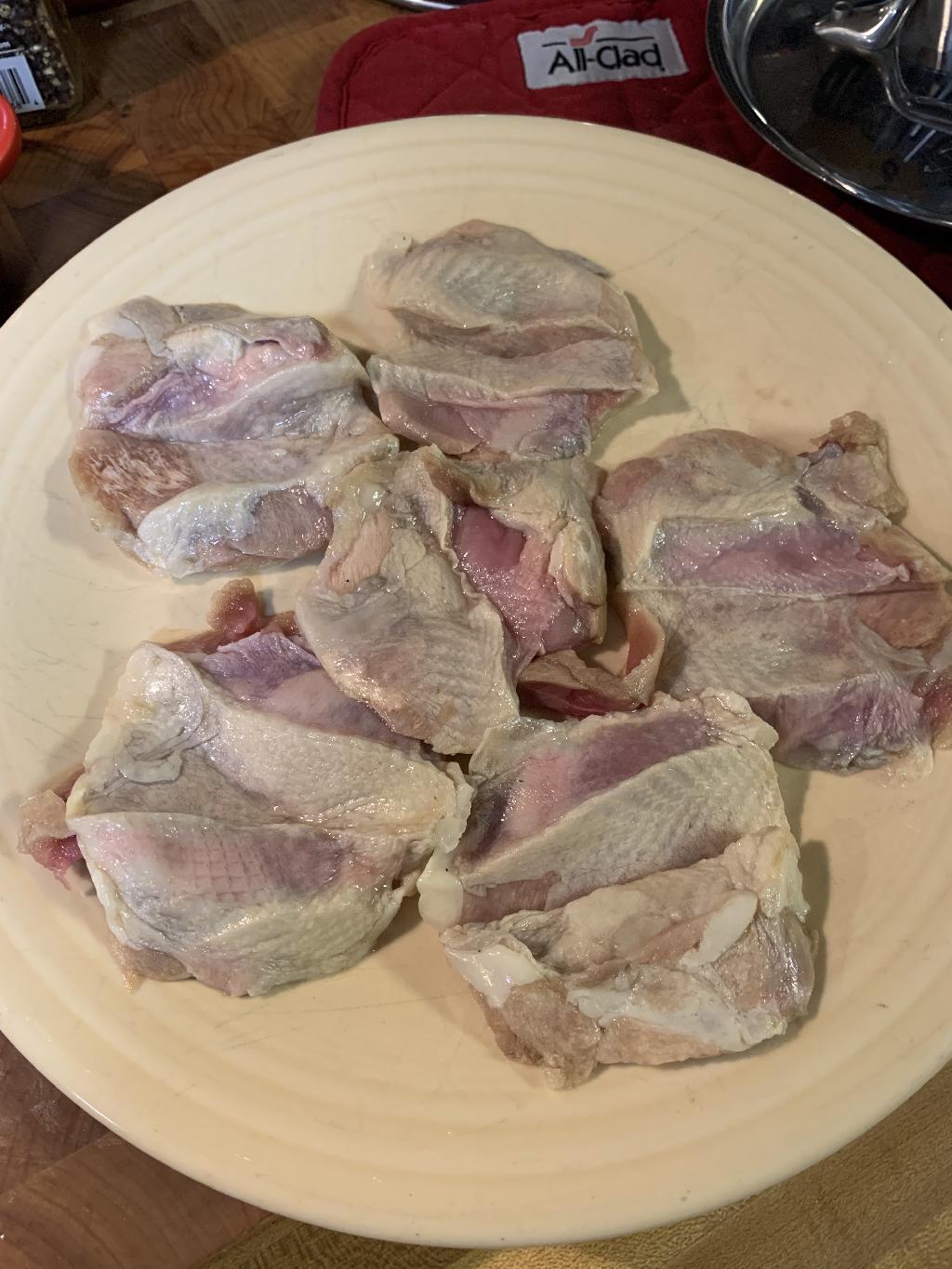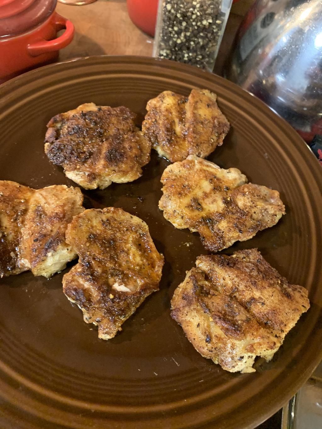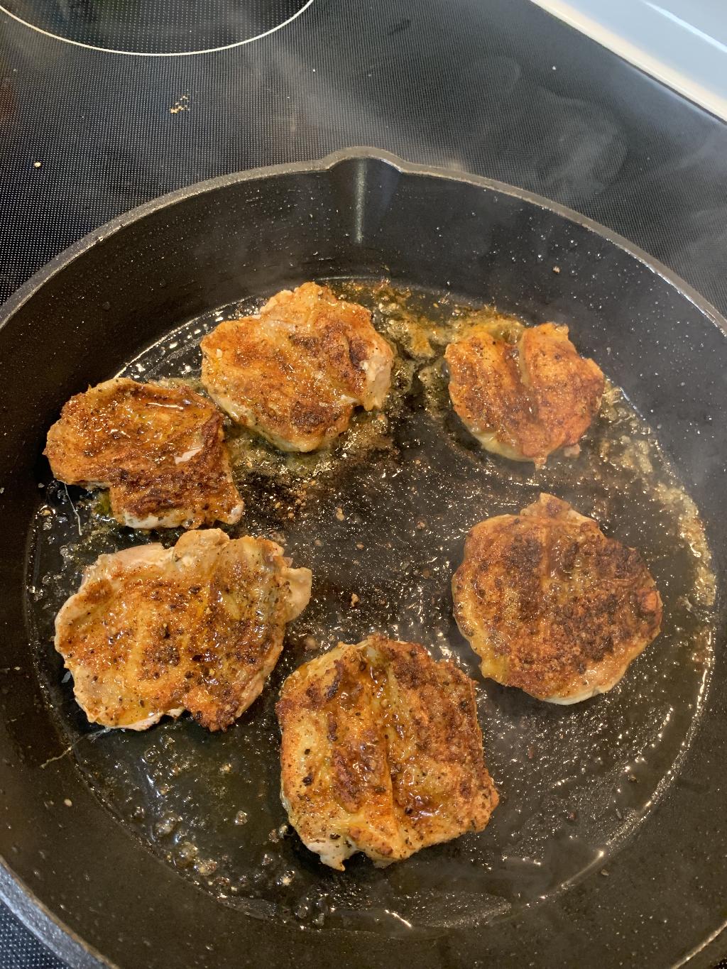 We recently moved into a smaller house with a smaller refrigerator, so I've been trying to use up some of my game bird meat to make room in the freezer. I have Quail we've killed training dogs, but I also have meat that I've purchased at the grocery store and online. Unfortunately, we don't really have that many wild birds around this part of Tennessee anymore, not like it was when I was a kid. These Quail Breast I had purchased online, it was only the breast meat, no bones, filleted so that both breasts were still connected as one piece. This allowed the breast to lay flat in the cast iron skillet ensuring that it made good contact with the cast iron pan. You might need to flatten your breast meat, depending on how it's cut. You can do so by covering it in plastic wrap and pounding it with a mallet a few times. Once it's flat, season it with salt, pepper, and blackening seasoning. Ensure that your skillet it hot and your buttered browned before adding Quail meat to skillet. These thin pieces of meat will cook super-fast!