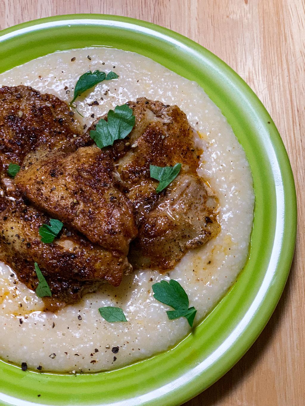 Step #7 Add cheesy grits to plate, top with Blackened Quail Breast and garnish with fresh chopped parsley. Season with additional salt and pepper if needed.