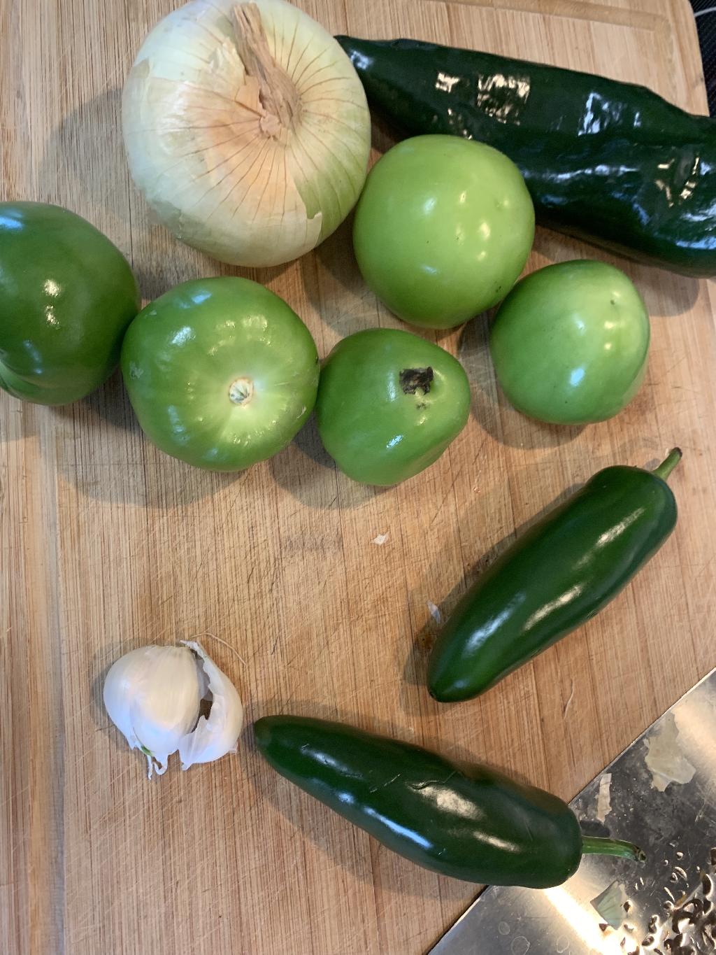 Step #1 Gather all ingredients together. Tomatillos, Jalapenos, Poblano Pepper Onion, Garlic, Lime and Cilantro.