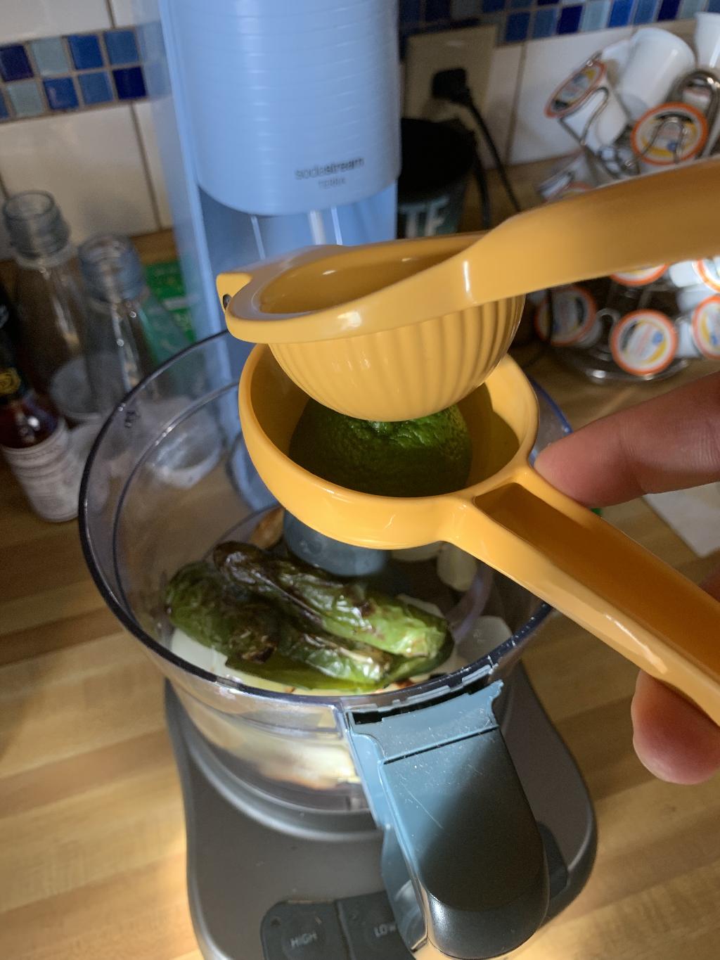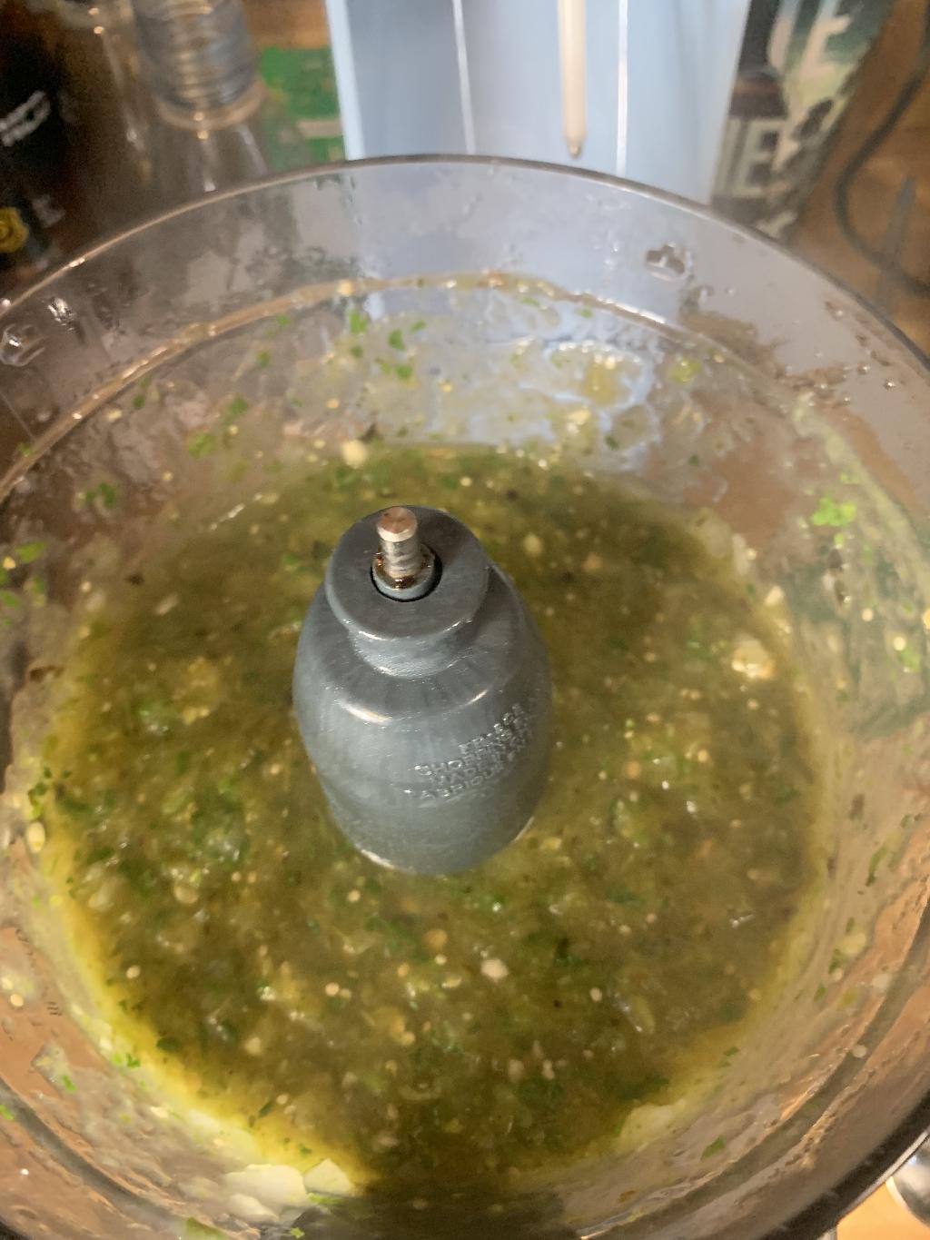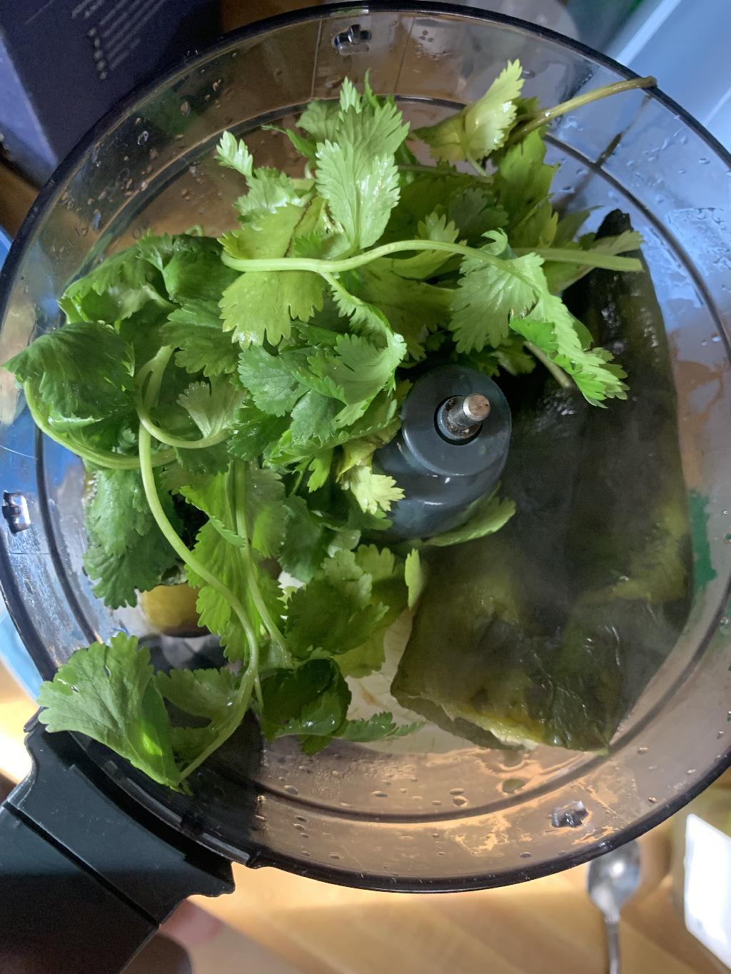 Step #8 Remove stems from peppers, then add to food processor. Add Onion, garlic cloves and Cilantro. Season with Salt and squeeze in juice from one Lime.