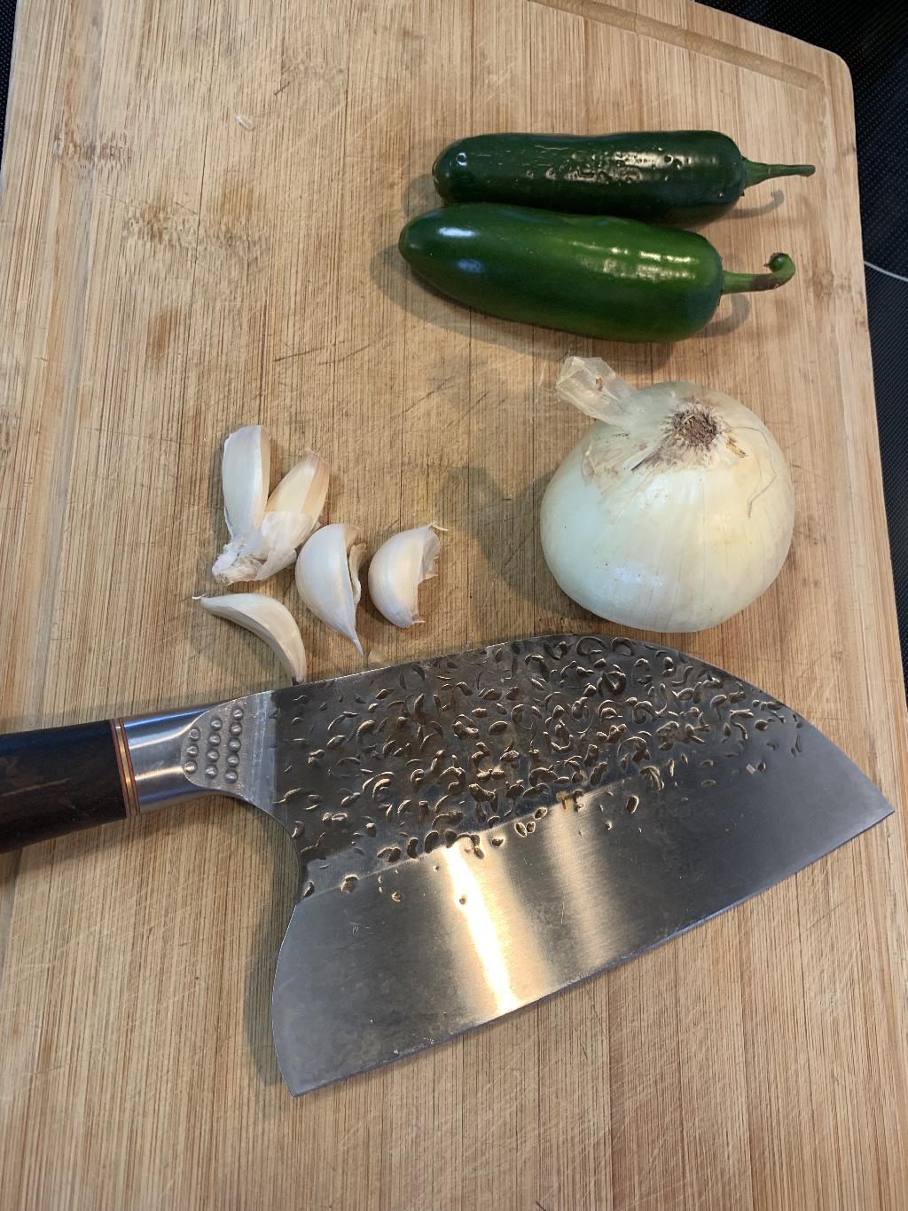 Step #1 Gather together your Jalapeno's, Onion and Garlic Cloves.