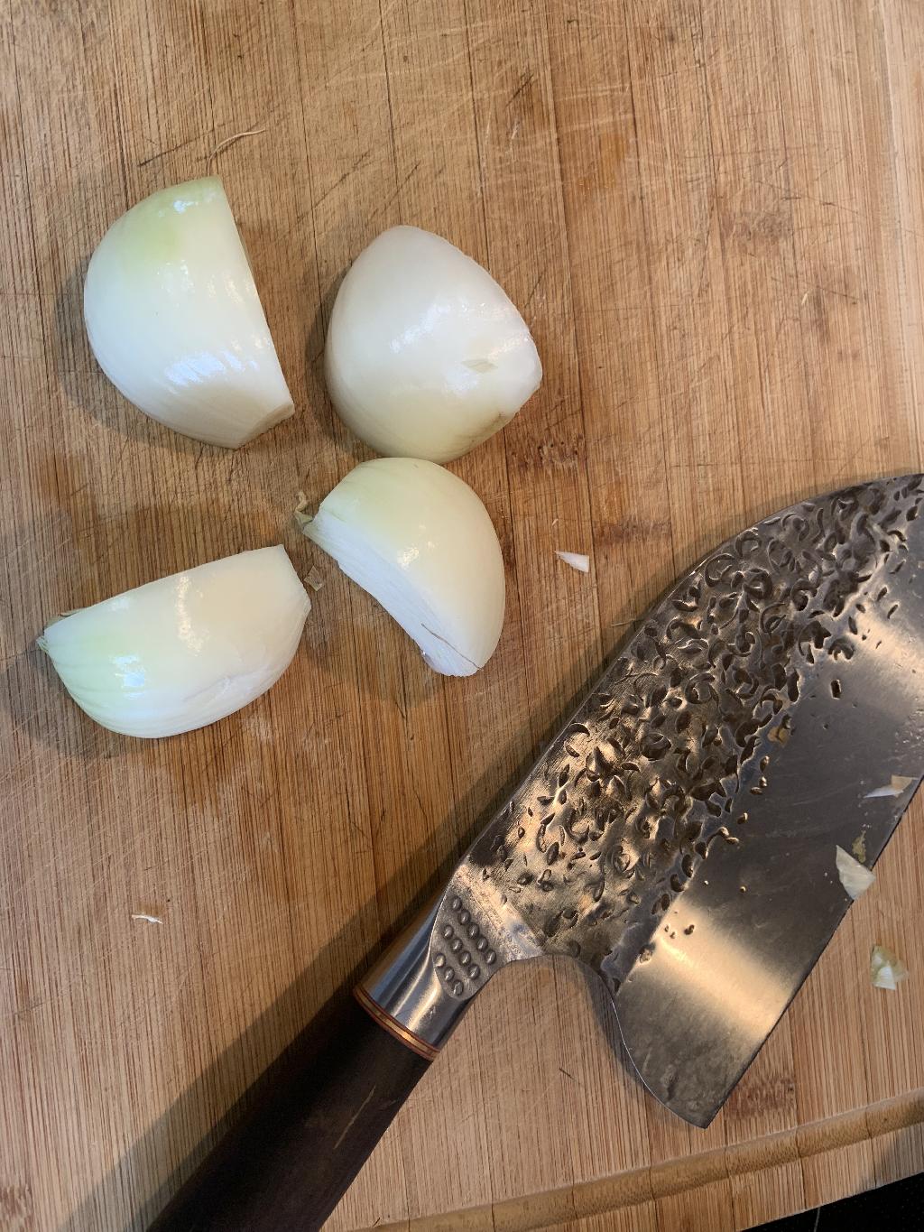 Step #4 Quarter the Onion then place the Tomatillos, Peppers and Onion on a small baking sheet.