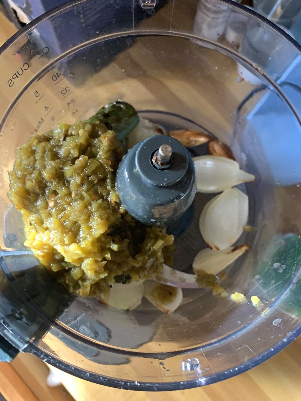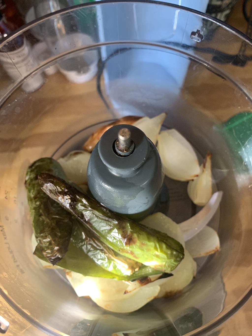 Step #8 Add charred Peppers, Onions and Garlic to food processor.