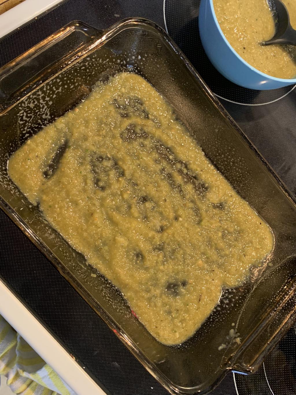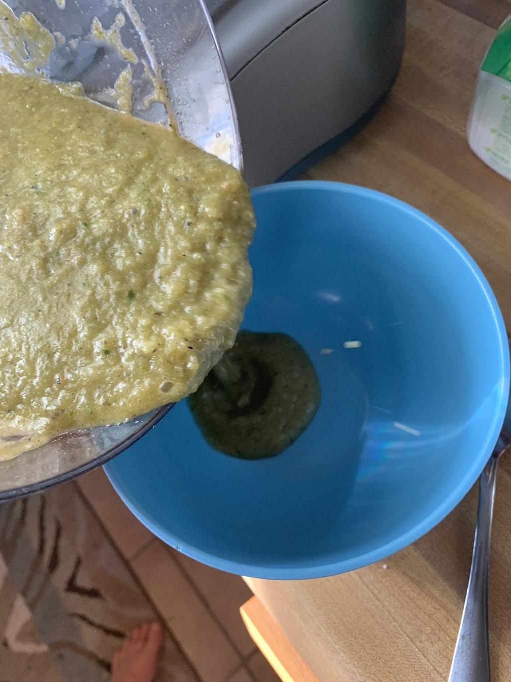 Step #26 Cover with remaining green sauce. Using a spatula to spread out into an even layer, working sauce down into groves.