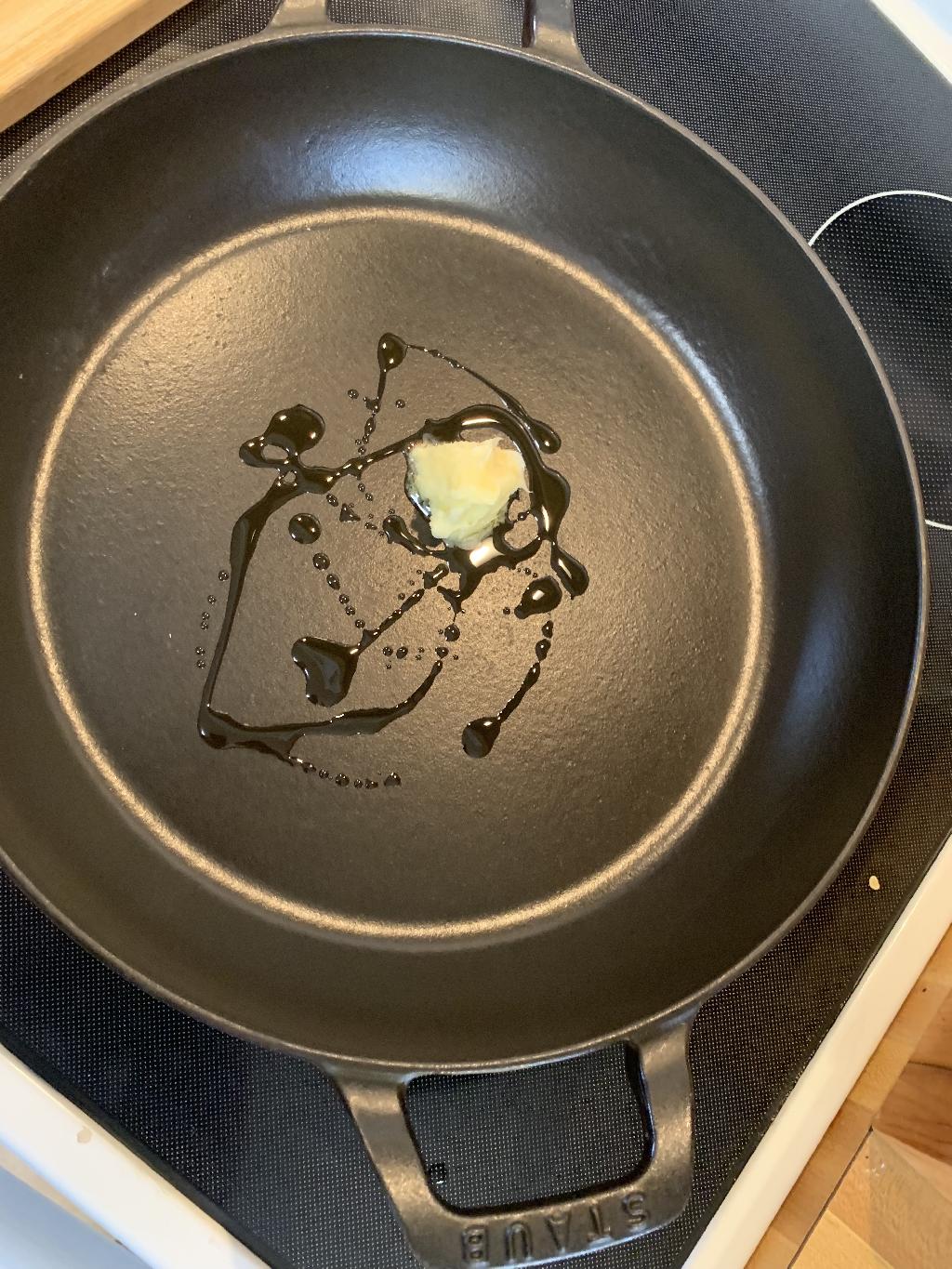 Step #6 Add one tablespoon of Olive Oil and one tablespoon of butter to skillet, setting heat to medium high.