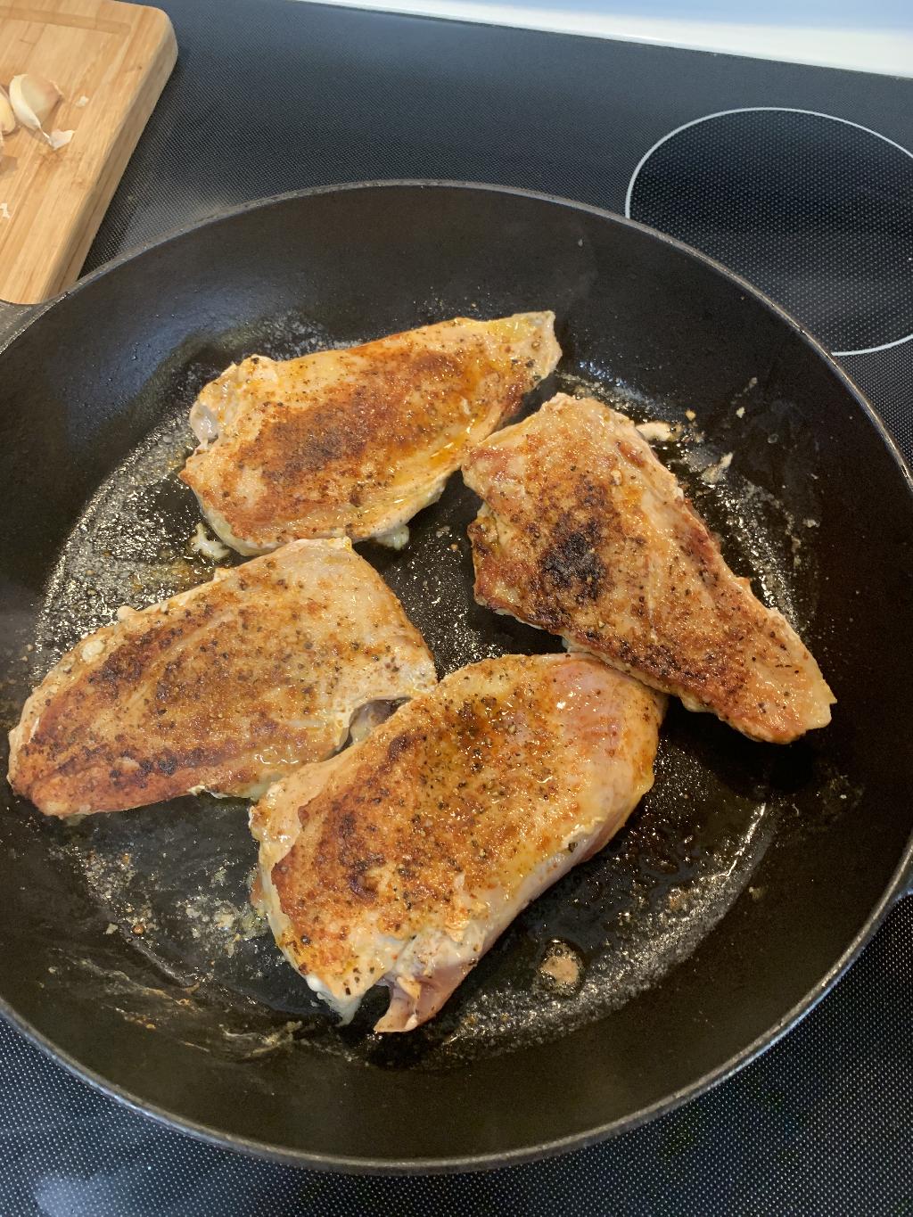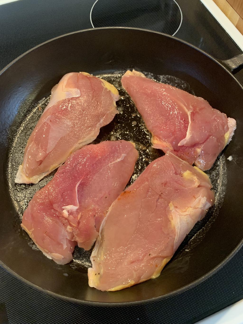 Step #7 When skillet is hot, place pheasant breast in pan, skin side down.
