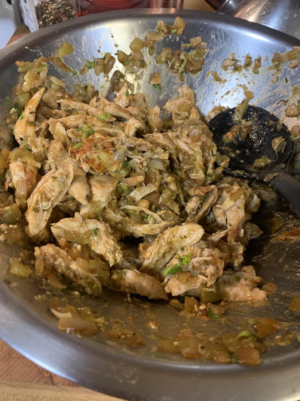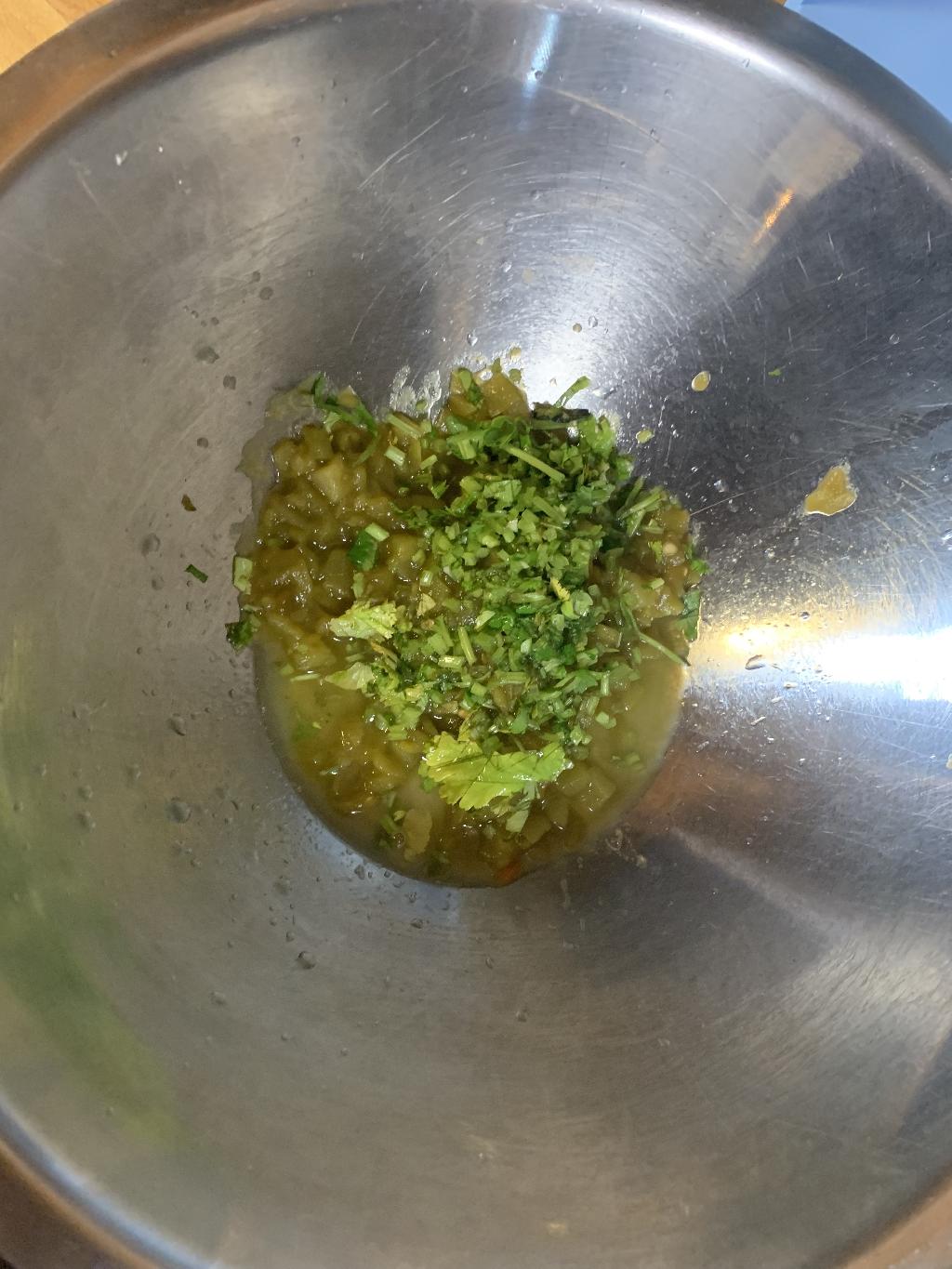 Step #14 Add one can of Green Chiles to a mixing bowl. Add in one cup of Salsa Verde. Juice from one Lime. One tablespoon of Taco Seasoning, Salt and Pepper. Add chopped Cilantro.