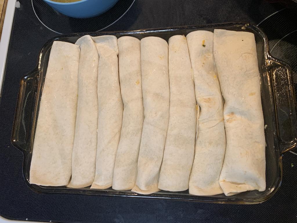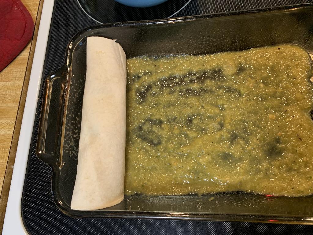 Step #24 Roll up and place in baking dish, with tortilla seam facing the bottom of the dish.