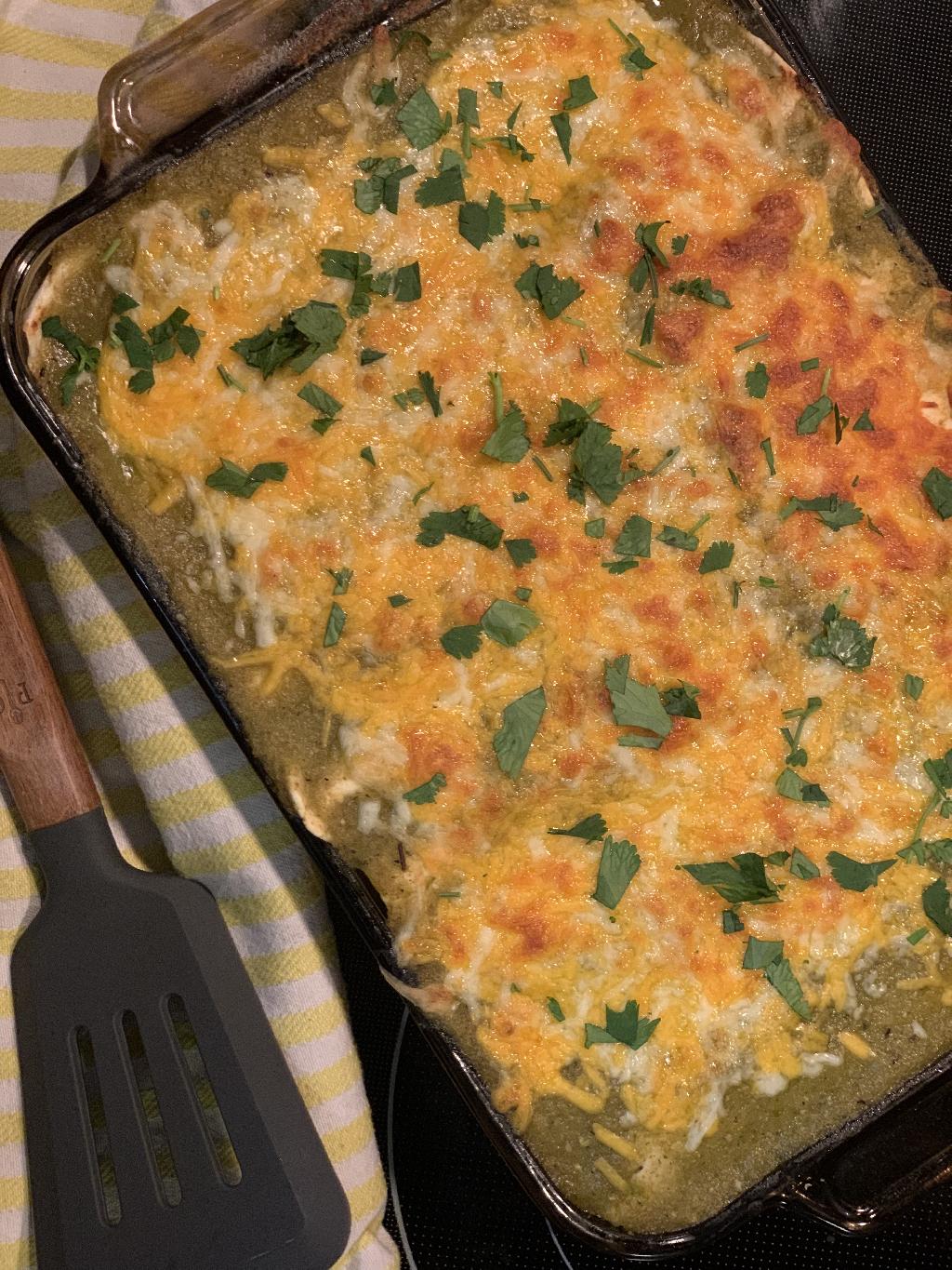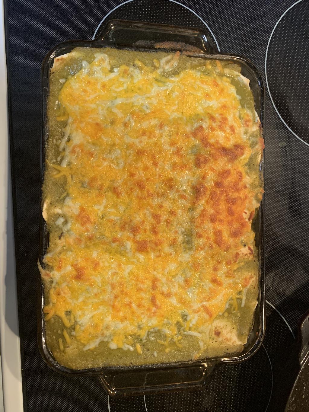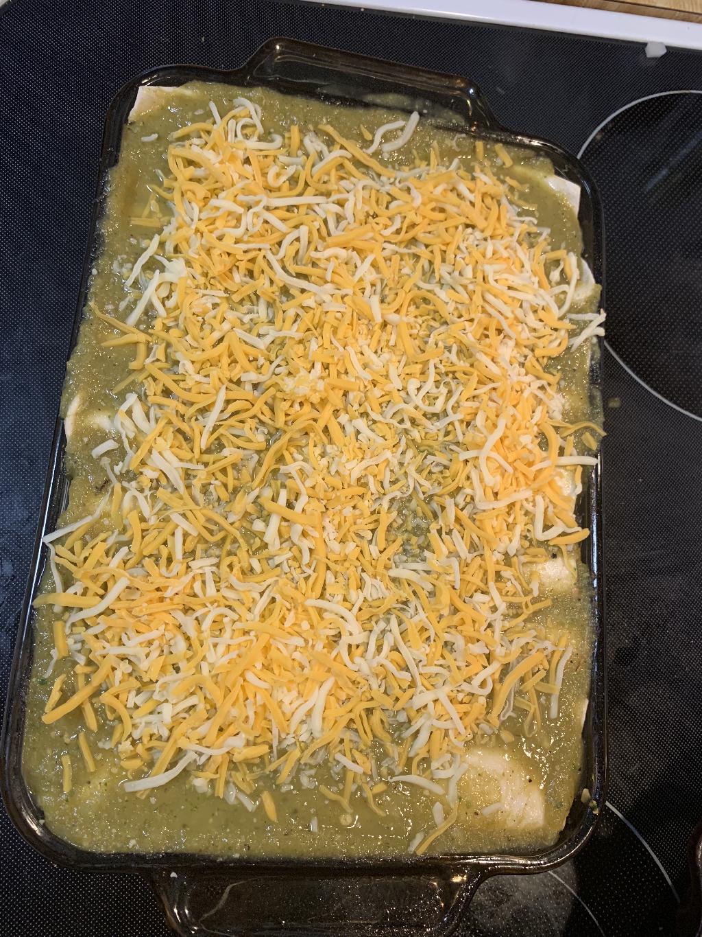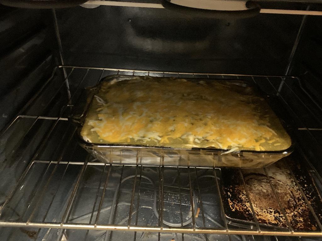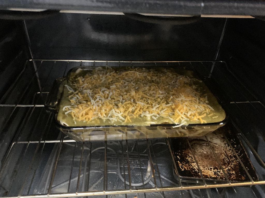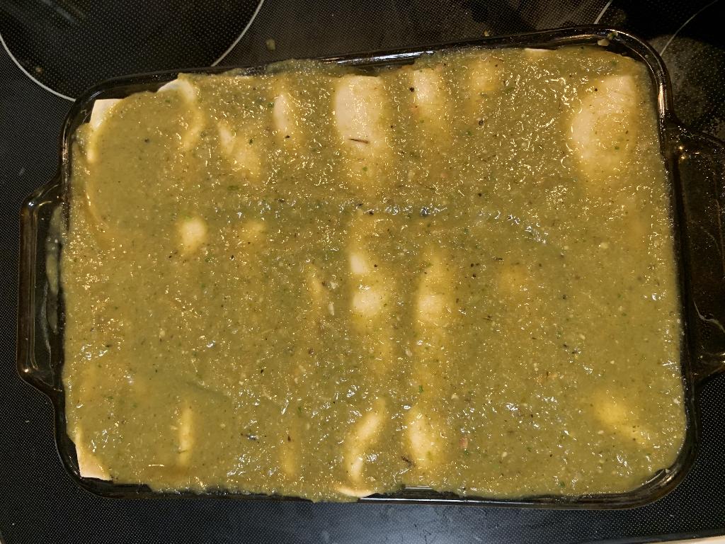 Step #20 Preheat oven to 350 degrees. Spray a 9 x 13 baking dish with some cooking spary, then spoon in enough of the green sauce to cover the bottom of the dish.