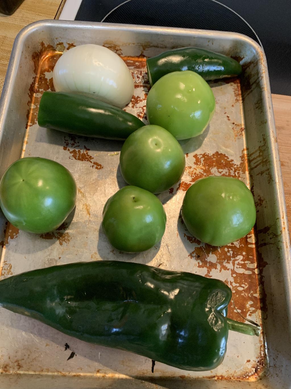 Step #1 Gather all ingredients together. Tomatillos, Jalapenos, Poblano Pepper Onion, Garlic, Lime and Cilantro.