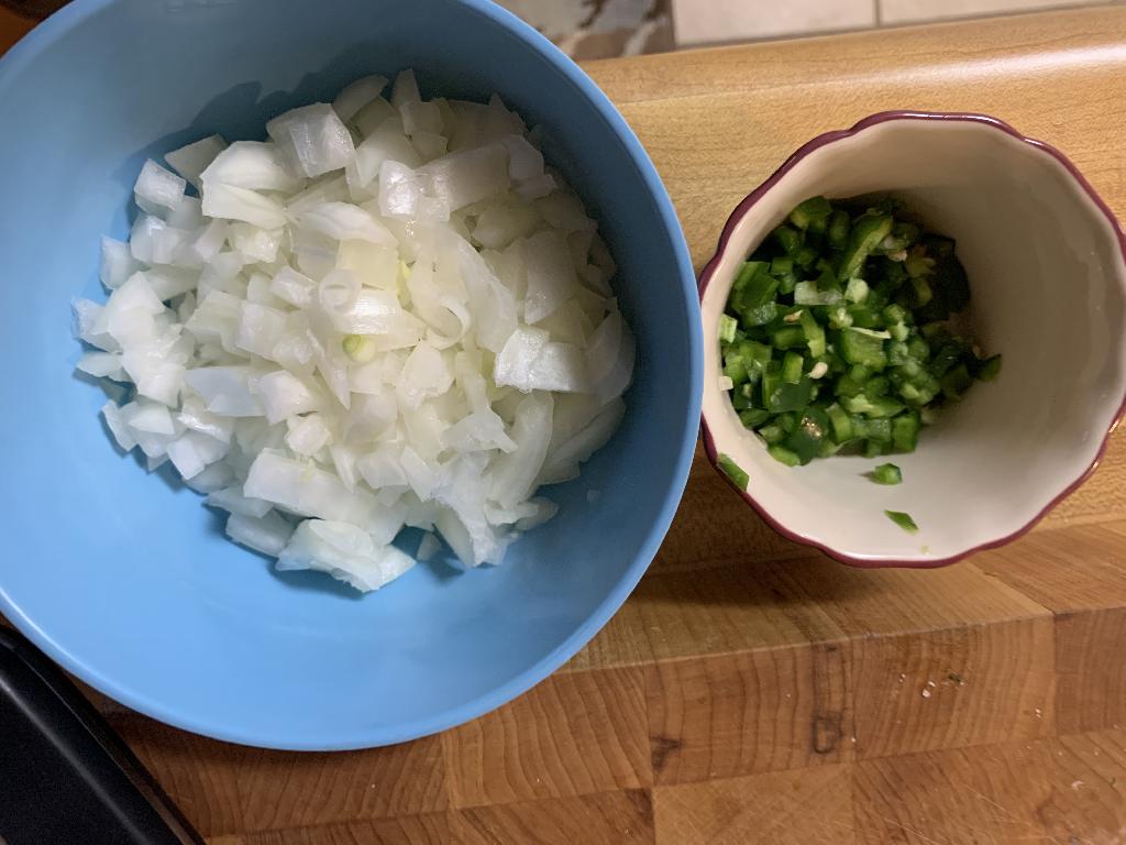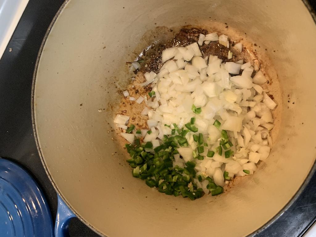Step #7 Add Onions and diced Jalapeno's to Dutch oven, season with salt and pepper.