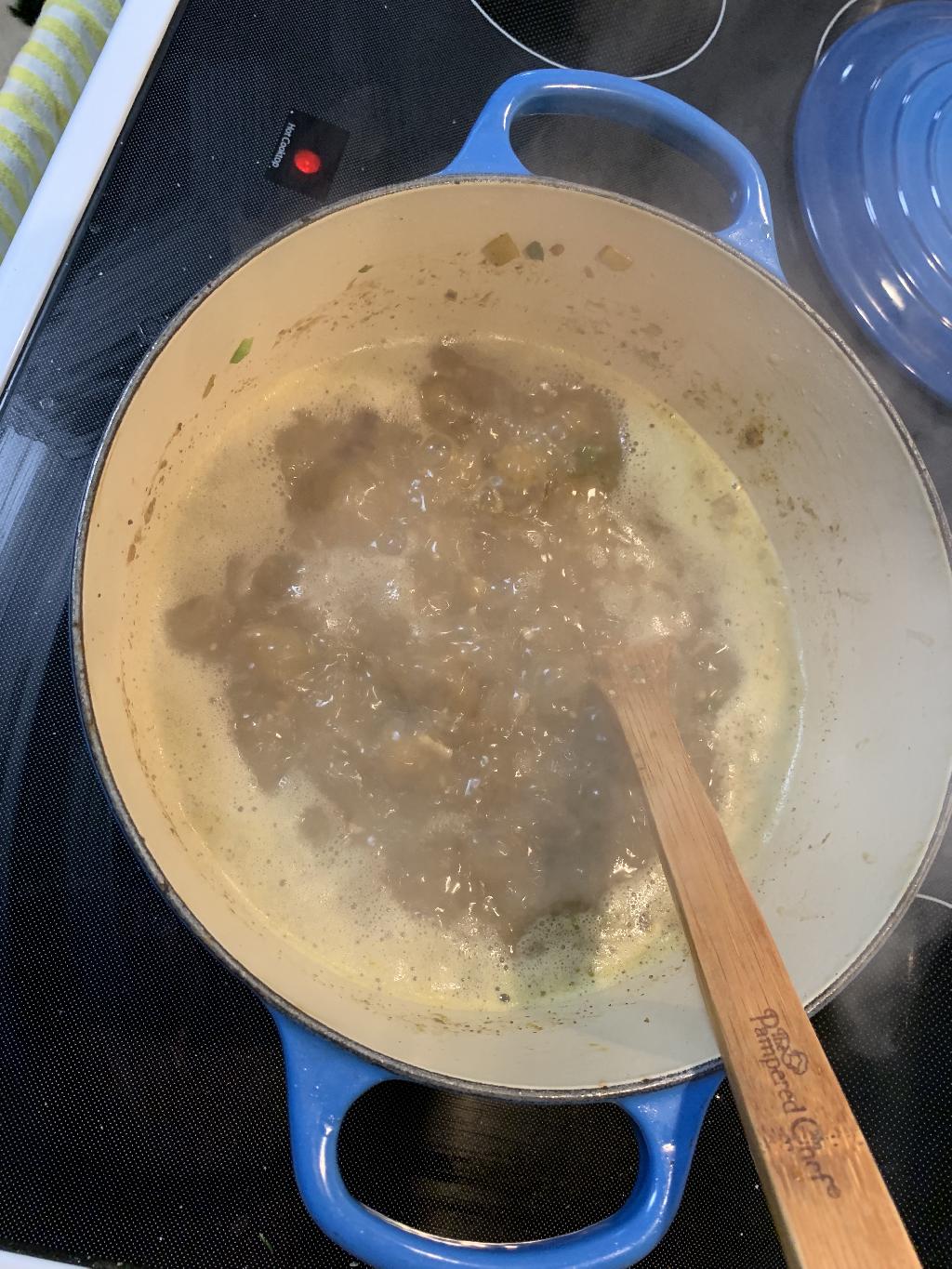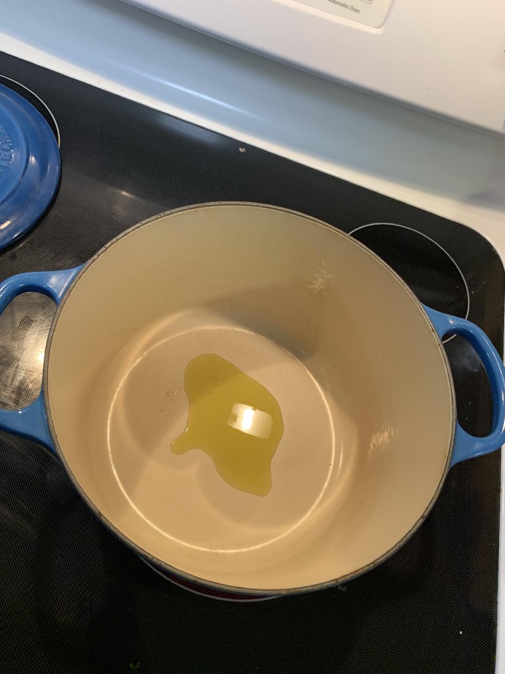 Step #3 Add one tablespoon of oil / butter to Dutch oven. Set heat to medium high and allow to get hot.