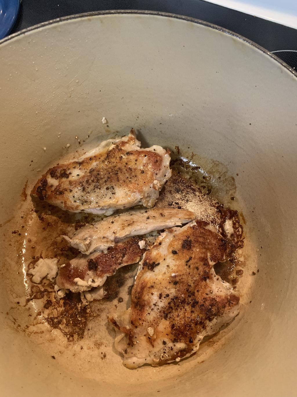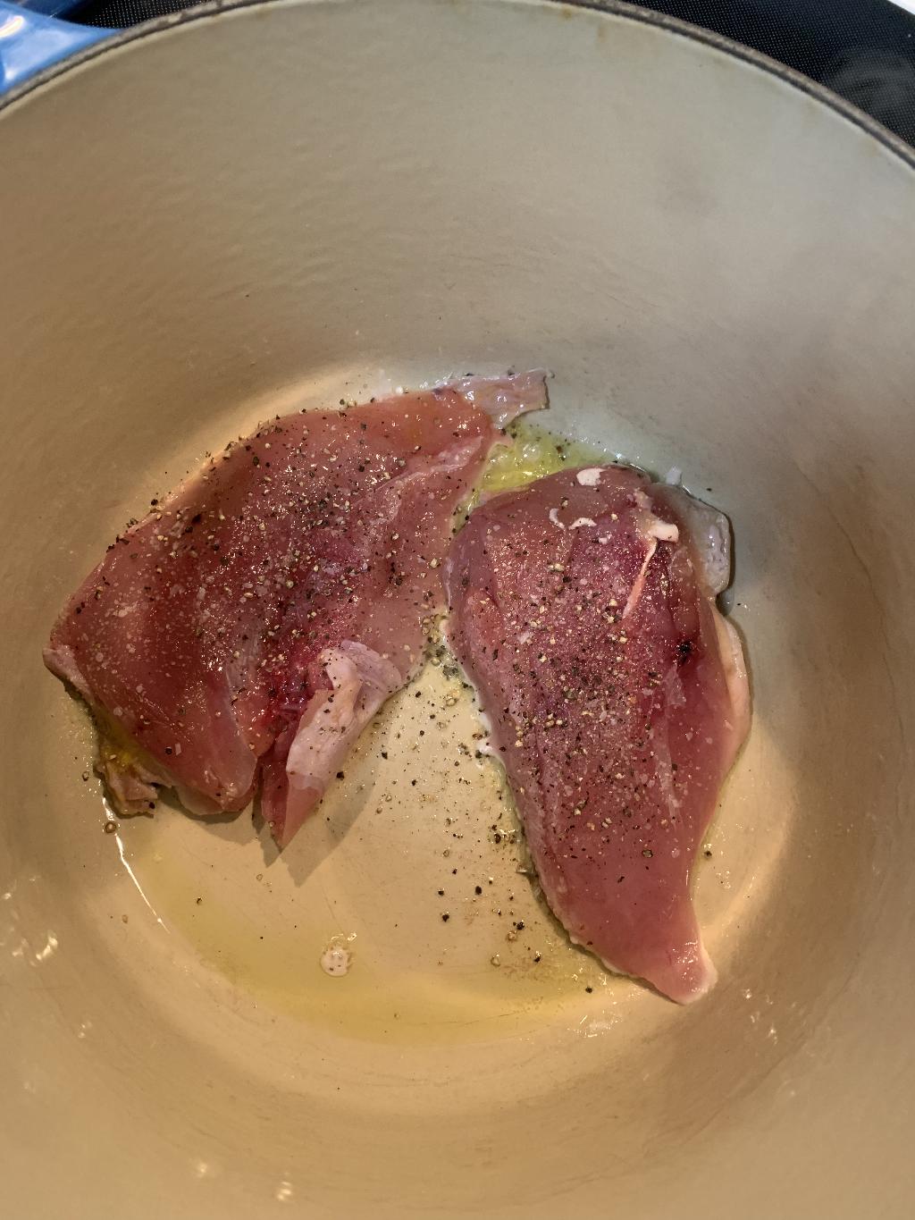 Step #4 Add Pheasant breast, skin side down, and allow to cook 4-5 minutes, until brown. You may only need to cook two of them at a time to prevent over crowding the pan.