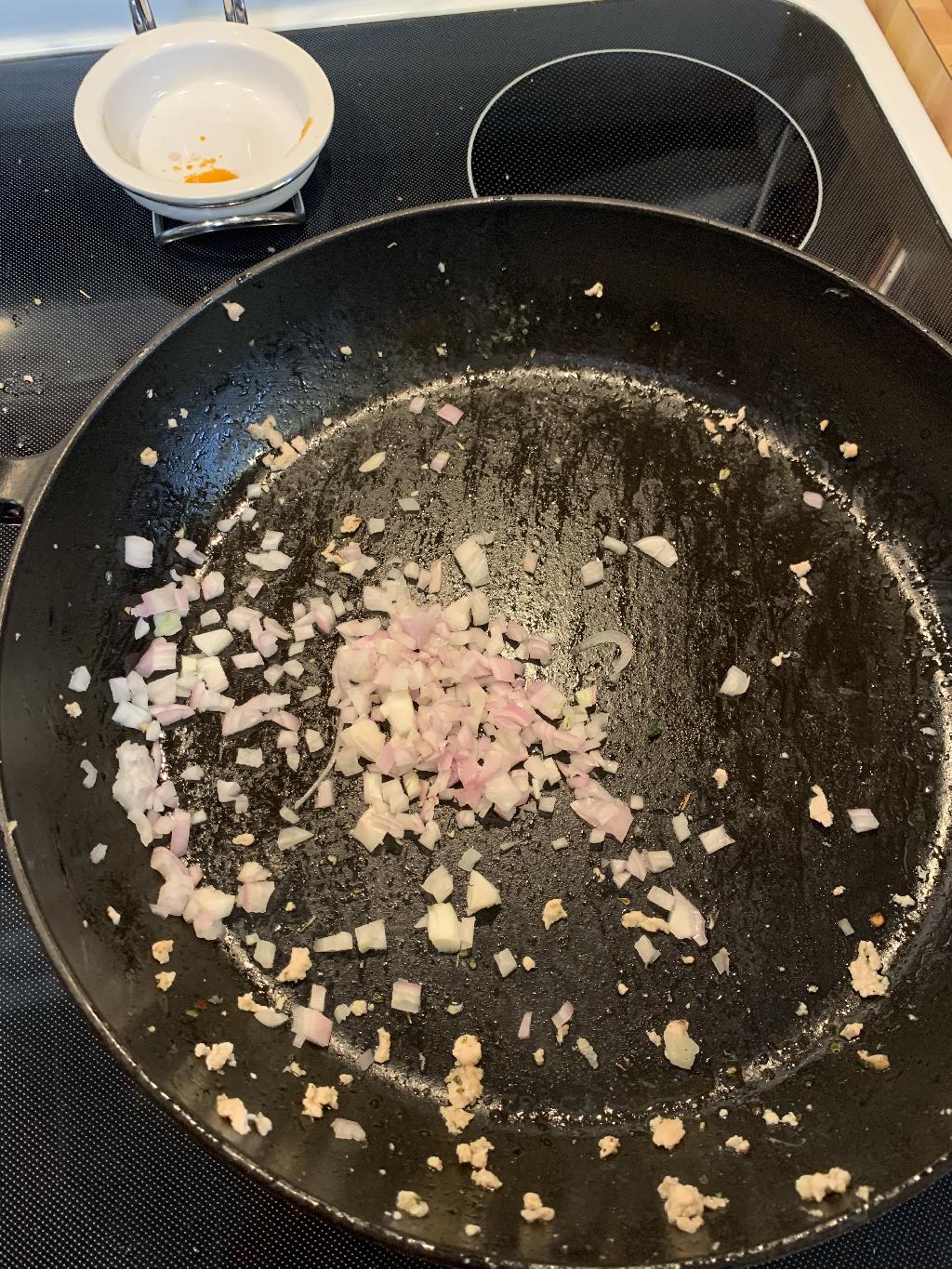 Step #5 Add diced Shallot to hot skillet and cook 4-5 minutes.